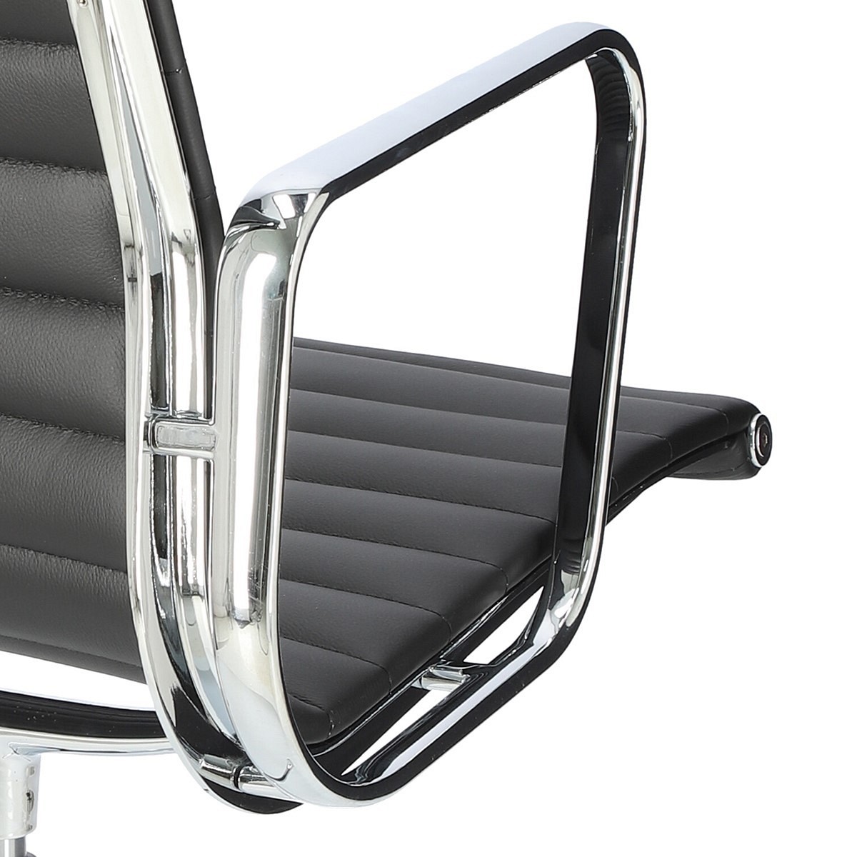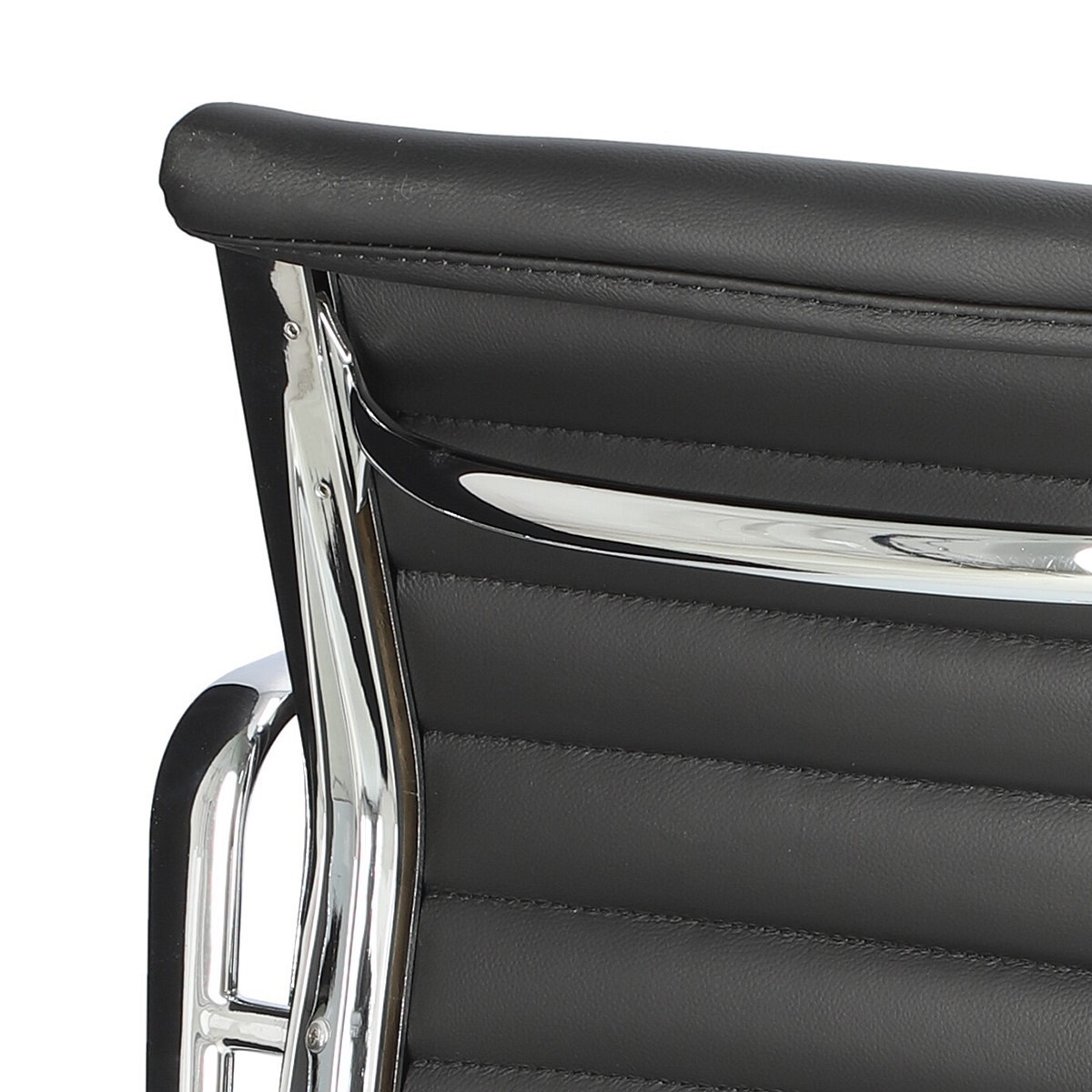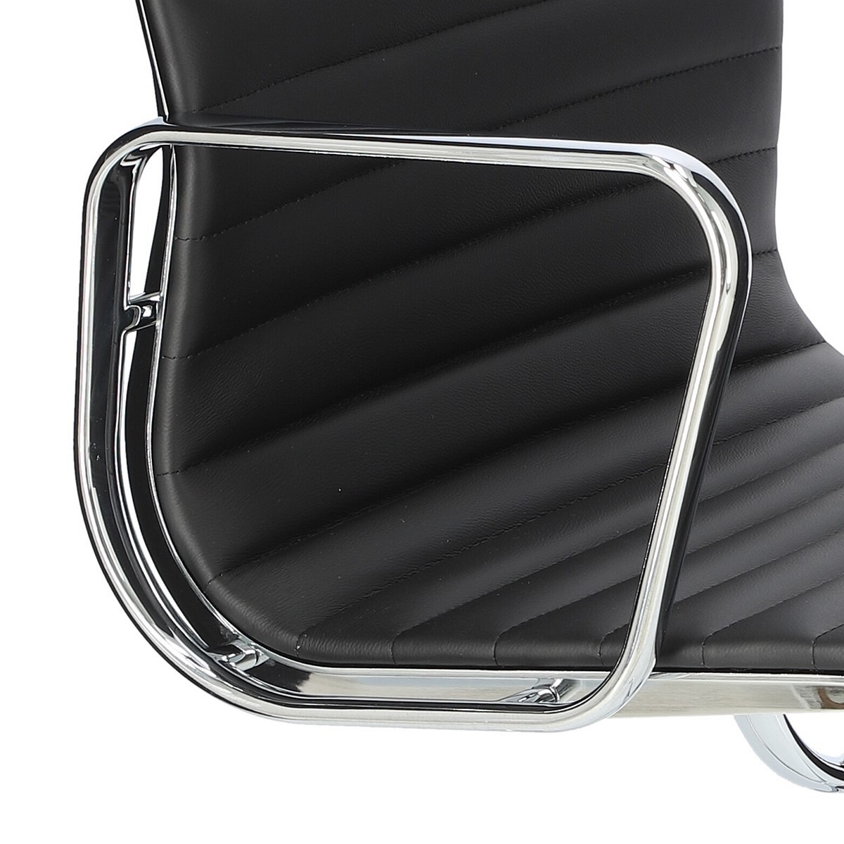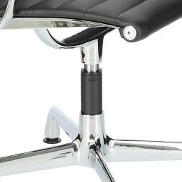 Fotel konferencyjny to nieodzowny element każdej sali konferencyjnej. Fotel CH1081T to przede wszystkim wysoka jakość wykonania oraz ponadczasowy design. Głównym założeniem tego fotela była lekkość formy i wygoda użytkownika. Dlatego materiał, na którym się siedzi jest zawieszony w powietrzu między dwoma metalowymi profilami. Siedzisko zostało zrobione ze skóry ekologicznej w czarnym kolorze. Poziome przeszycia na siedzisku dodają fotelowi klasyczny wygląd. Chromowane elementy fotela dodają całości eleganckiego wyglądu. Obrotowa baza na nóżkach wykonana jest również z chromowanego metalu. Krzesło nie posiada mechanizmu regulacji wysokości.