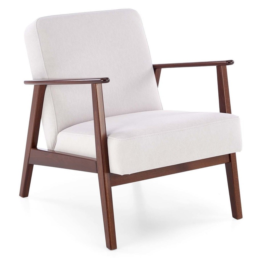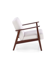 Fotel MILANO 1S to połączenie stylu i wygody. Wykonany z solidnego drewna bukowego oraz pokryty tkaniną CASTEL w kolorze jasnego beżu, doskonale komponuje się z klasycznymi wnętrzami. Wykończenie w ciemnym orzechu dodaje mu elegancji i trwałości.
