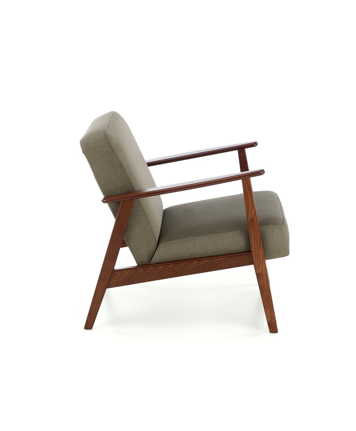 Fotel MILANO 1S to połączenie stylu i wygody. Wykonany z solidnego drewna bukowego oraz pokryty tkaniną CASTEL w kolorze oliwkowym, doskonale komponuje się z klasycznymi wnętrzami. Wykończenie w ciemnym orzechu dodaje mu elegancji i trwałości.