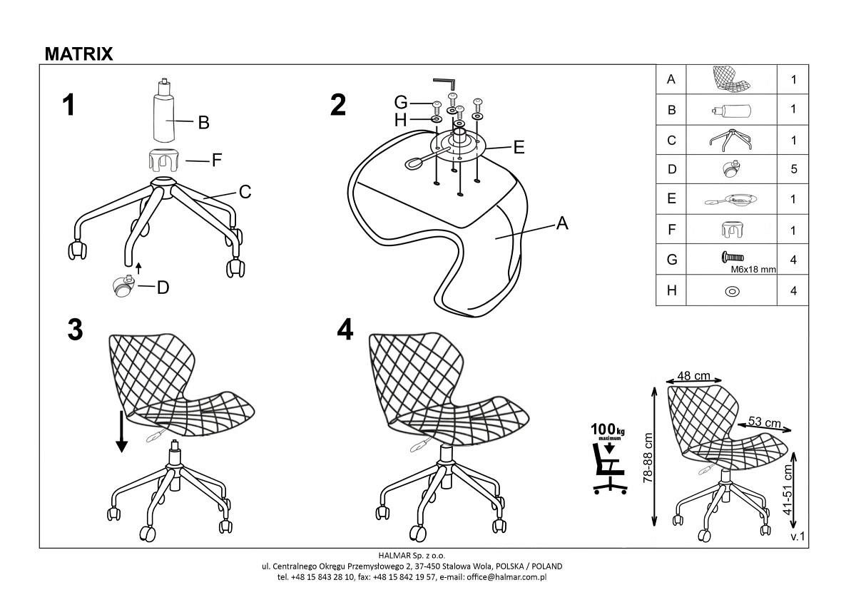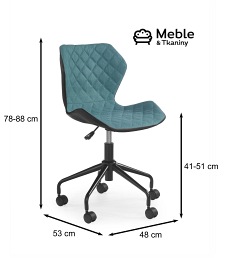 MATRIX to nowoczesny design, który z łatwością wkomponuje się w młodzieżowe wnętrze. Fotel obszyty został dwiema tkaninami: siedzisko jest wykończone pikowaną tkaniną, a tył fotela eko-skórą. Solidna podstawa fotela została wykonana ze stali nierdzewnej pomalowanej proszkowo na kolor czarny. Wyposażony jest w mechanizm pozwalający na płynną regulację wysokości siedziska oraz obrót wokół własnej osi. Kółka znajdujące się w zestawie są przeznaczone do powierzchni miękkich.