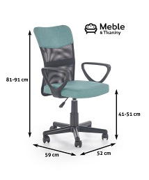 Model Timmy to fotel stworzony z myślą o pokojach młodzieżowych. Posiada lekko wychylone i zaokrąglone oparcie oraz miękkie siedzisko, które razem nadają mu nieprzeciętnego komfortu użytkowania. Timmy obszyty został miękką, kolorową tkaniną połączoną z przewiewną siatką. Ponadto wyposażono go w kółka pozwalające na wygodne przemieszczanie oraz w mechanizm podstawowy służący do regulacji wysokości siedziska, dzięki czemu możemy je dopasować do każdego biurka. Model dostępny w trzech wersjach kolorystycznych: turkusowo-czarnym, popielato-czarnym i różowo-czarnym.