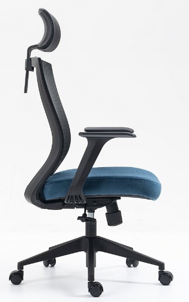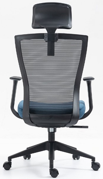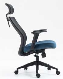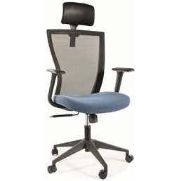 Fotel obrotowy ten to doskonałe połączenie wygody, funkcjonalności i nowoczesnego designu. Jego siedzisko i oparcie wykonane są z wysokiej jakości tkaniny i siatki w świeżym kolorze niebieskim, co nadaje wnętrzu energii i natury. Czarne elementy, takie jak stelaż wykonany z wytrzymałego tworzywa, podkreślają elegancję i nowoczesny charakter fotela.