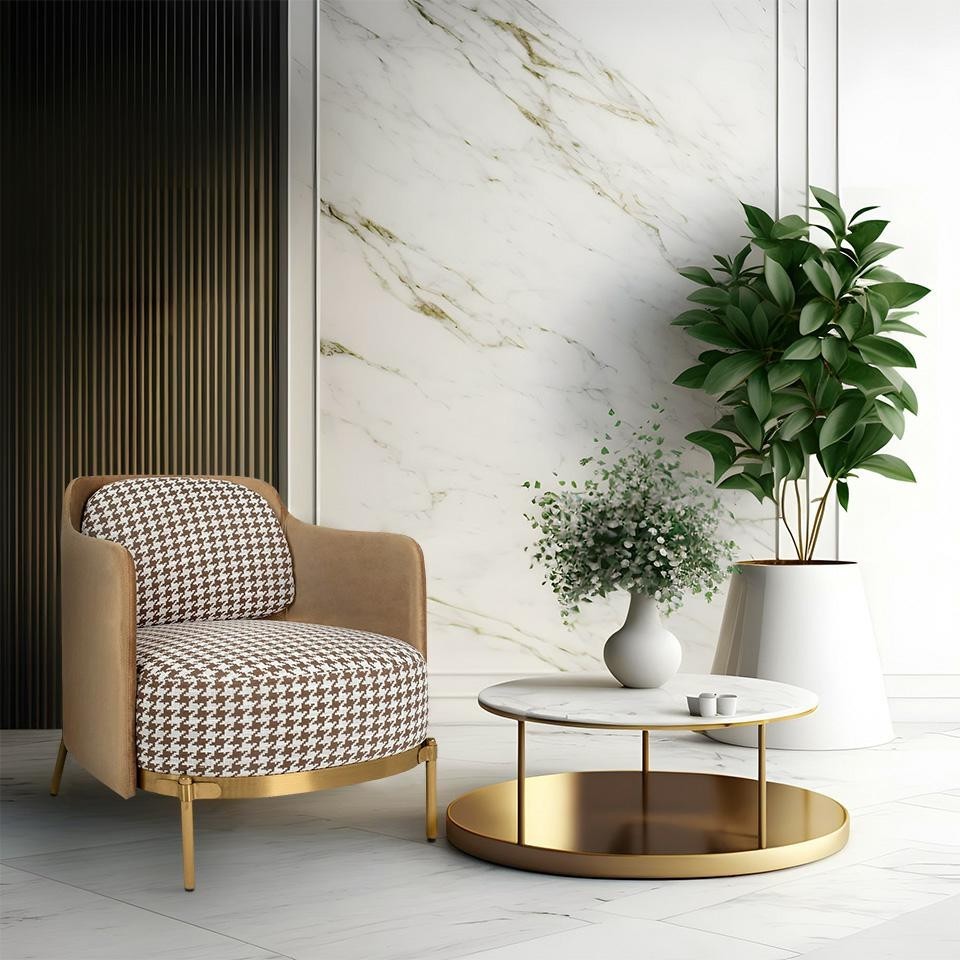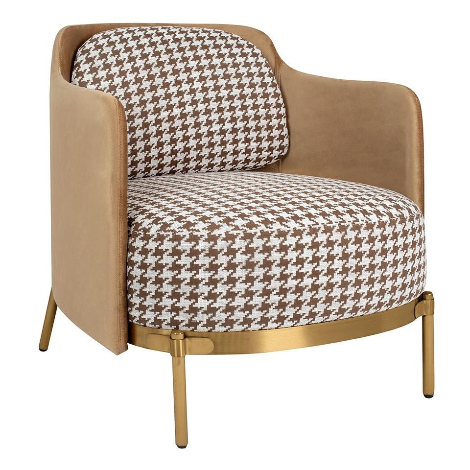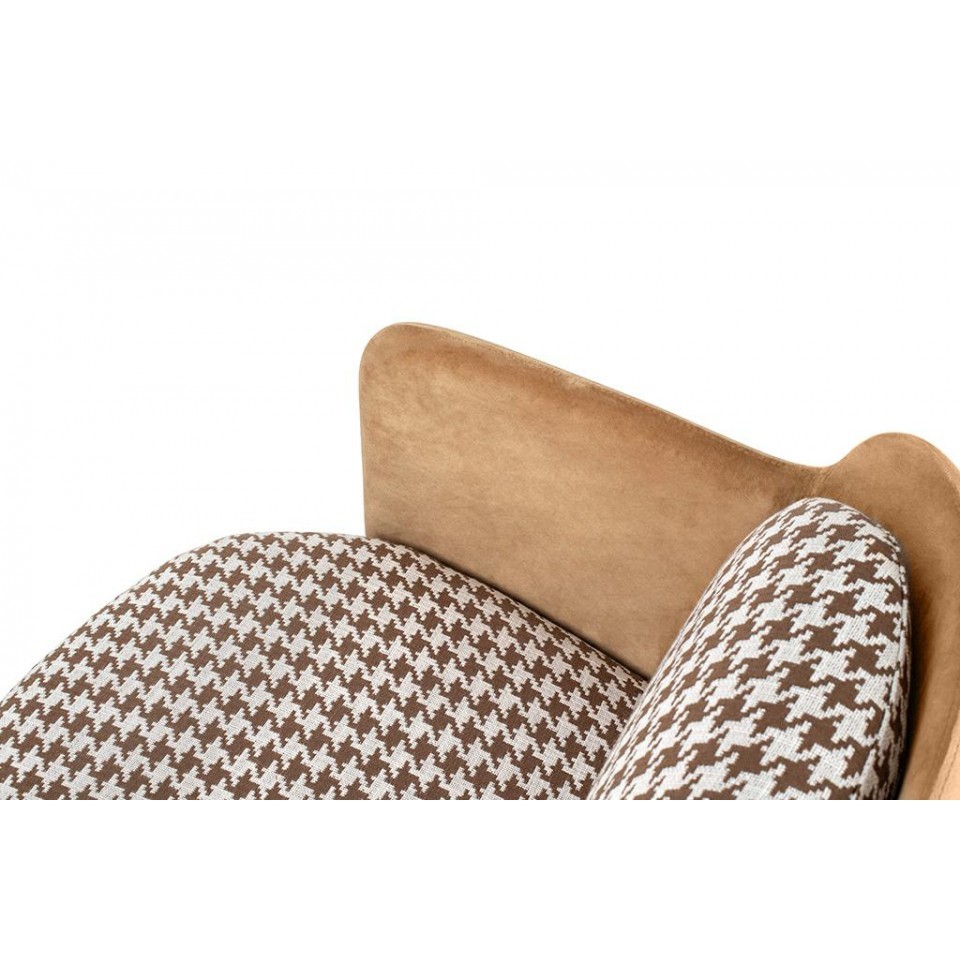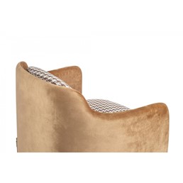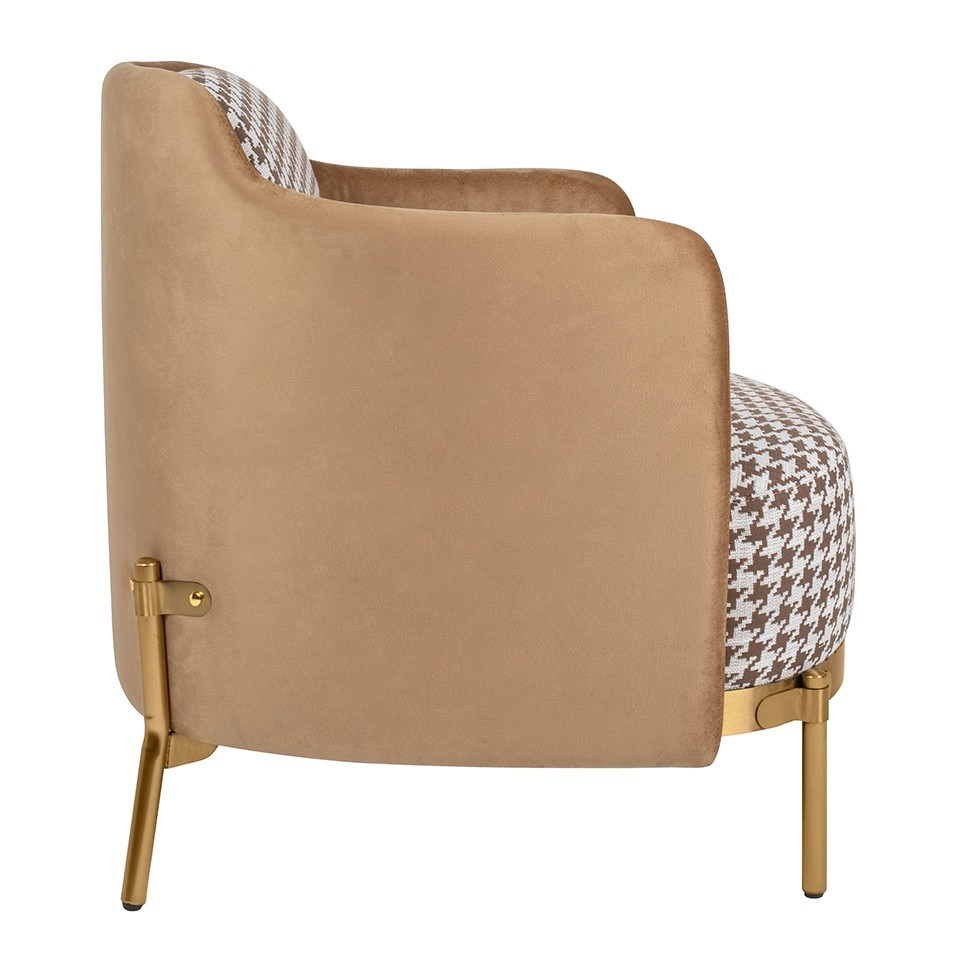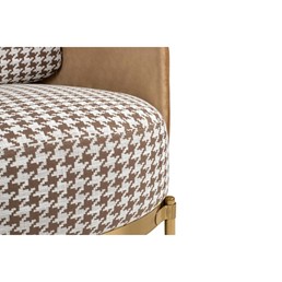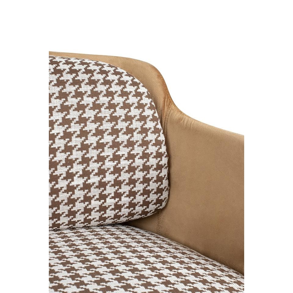 Fotel VENICE obity wyjątkowym wzorem w pepitkę, to wyraz pełnej klasy elegancji w każdym wnętrzu. Pepitka, będąca ikoną zarówno w modzie, jak i w aranżacji wnętrz, nadaje temu fotelowi niepowtarzalny charakter, łącząc ponadczasowy wzór z nowoczesnym designem. Fotel zachwyca nie tylko wzornictwem, ale również wygodą siedzenia. Siedzisko zostało tapicerowane tkaniną, co dodaje mu subtelnej finezji. Dodatkowo, tył fotela wraz z podłokietnikami został obity delikatną welurową tkaniną, co nie tylko wzmacnia efekt kontrastu, ale także podkreśla elegancję i trwałość. Złota metalowa podstawa doskonale współgra z wzorem pepitki, tworząc spójną kompozycję i nadając fotelowi wyjątkowego charakteru. Ta harmonia kolorów i materiałów sprawia, że fotel VENICE doskonale odnajdzie się w każdej nowoczesnej aranżacji, dodając pomieszczeniu nuty luksusu i stylu.
