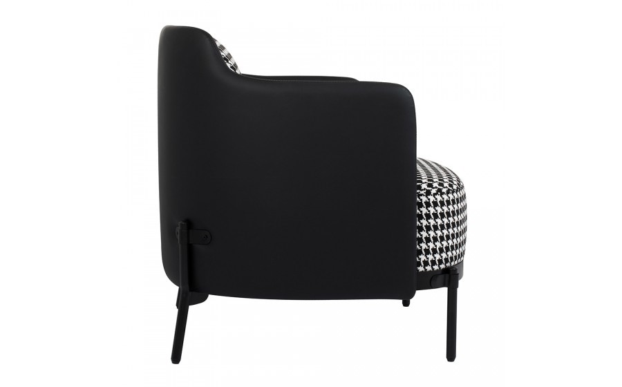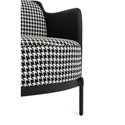 Fotel VENICE BLACK obity wyjątkowym wzorem w pepitkę, to wyraz pełnej klasy elegancji w każdym wnętrzu. Pepitka, będąca ikoną zarówno w modzie, jak i w aranżacji wnętrz, nadaje temu fotelowi niepowtarzalny charakter, łącząc ponadczasowy wzór z nowoczesnym designem. Fotel zachwyca nie tylko wzornictwem, ale również wygodą siedzenia. Siedzisko zostało tapicerowane tkaniną, co dodaje mu subtelnej finezji. Dodatkowo, tył fotela wraz z podłokietnikami został obity czarną ekoskórą, co nie tylko wzmacnia efekt kontrastu, ale także podkreśla elegancję i trwałość. Czarna metalowa podstawa doskonale współgra z wzorem pepitki, tworząc spójną kompozycję i nadając fotelowi wyjątkowego charakteru. Ta harmonia kolorów i materiałów sprawia, że fotel VENICE BLACK doskonale odnajdzie się w każdej nowoczesnej aranżacji, dodając pomieszczeniu nuty luksusu i stylu.