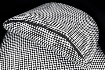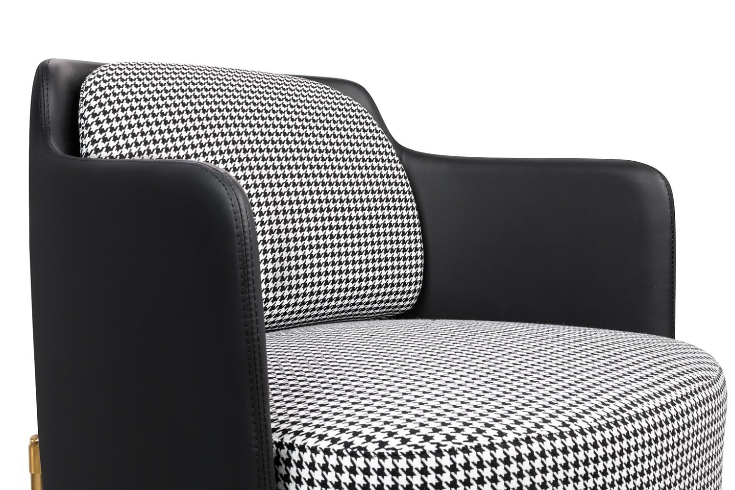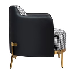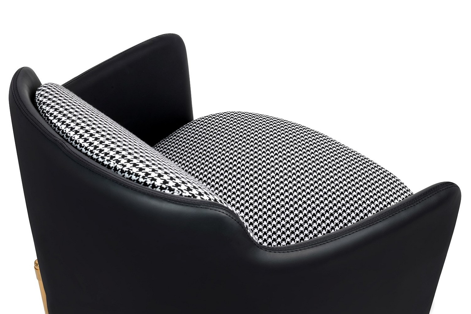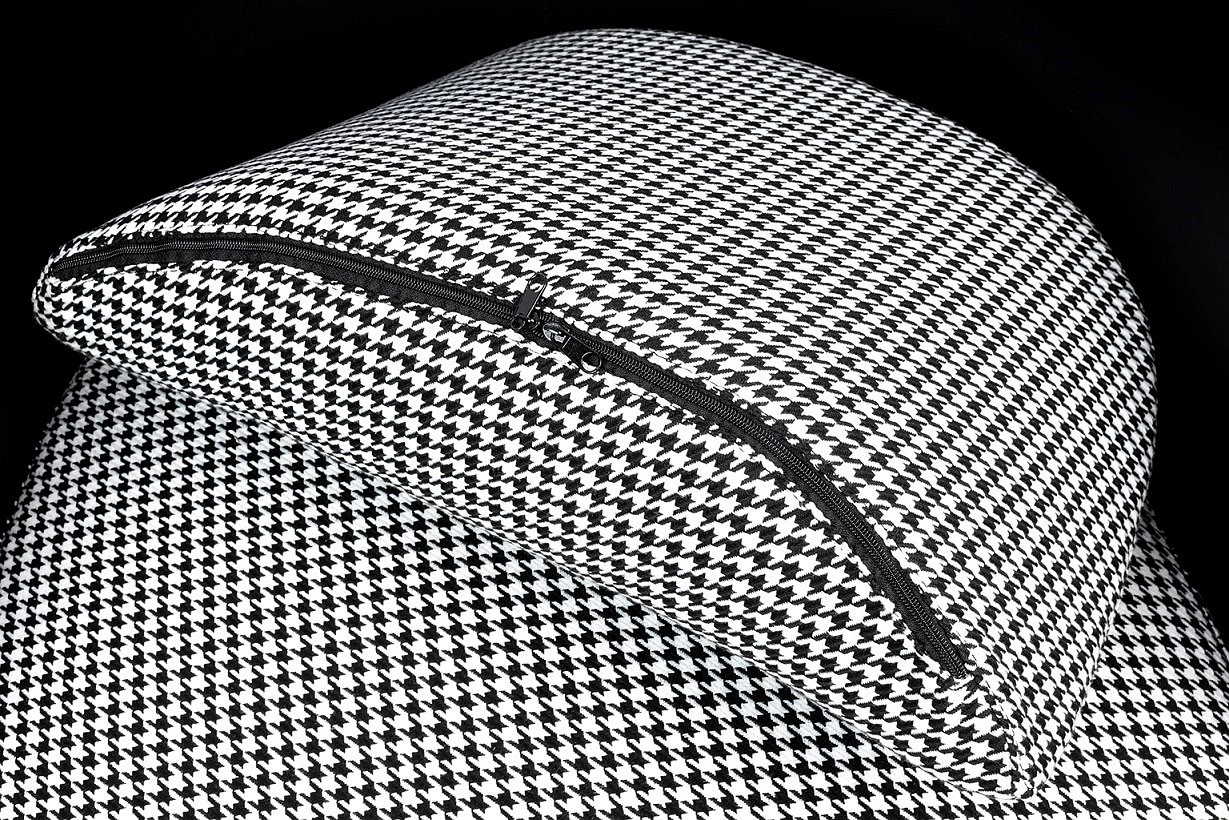 Siedzisko oraz poduszka obszyte jest tkaniną w biało-czarną pepitkę.