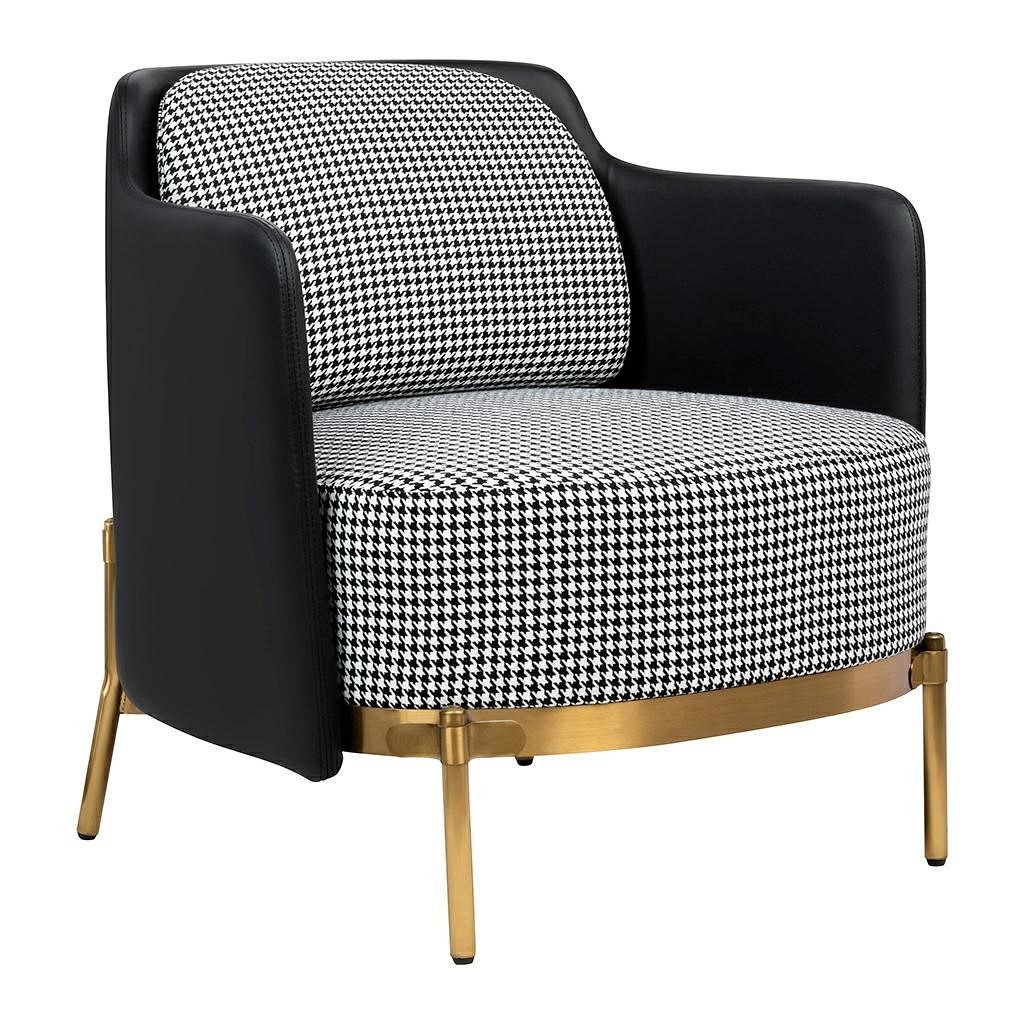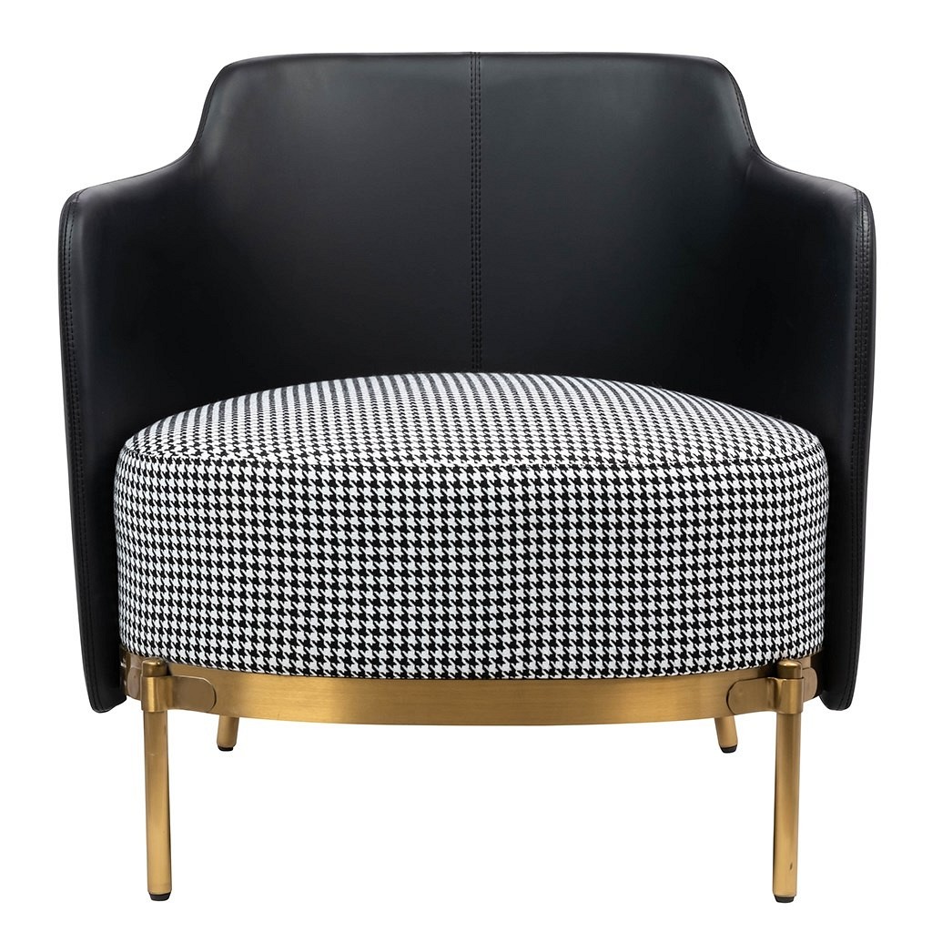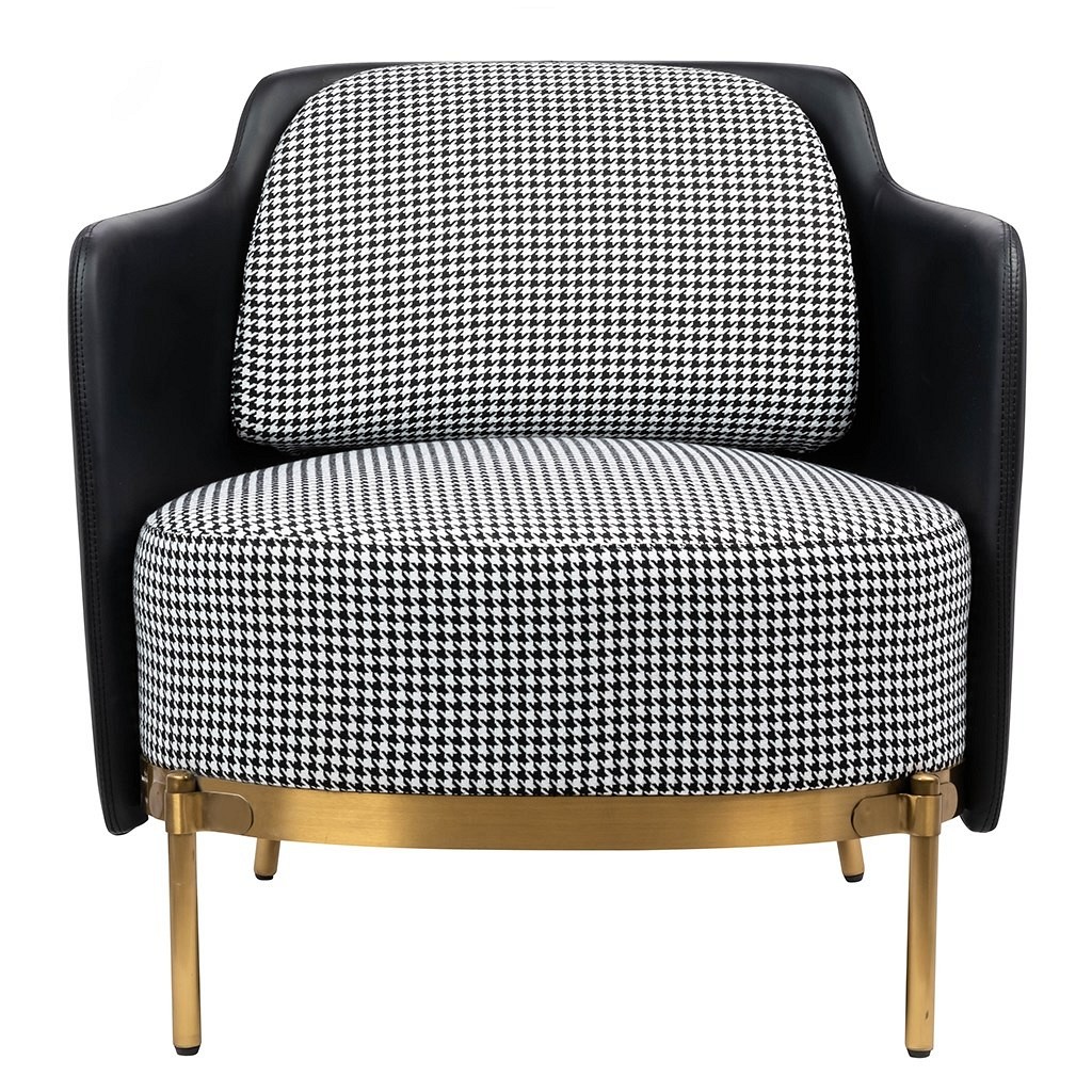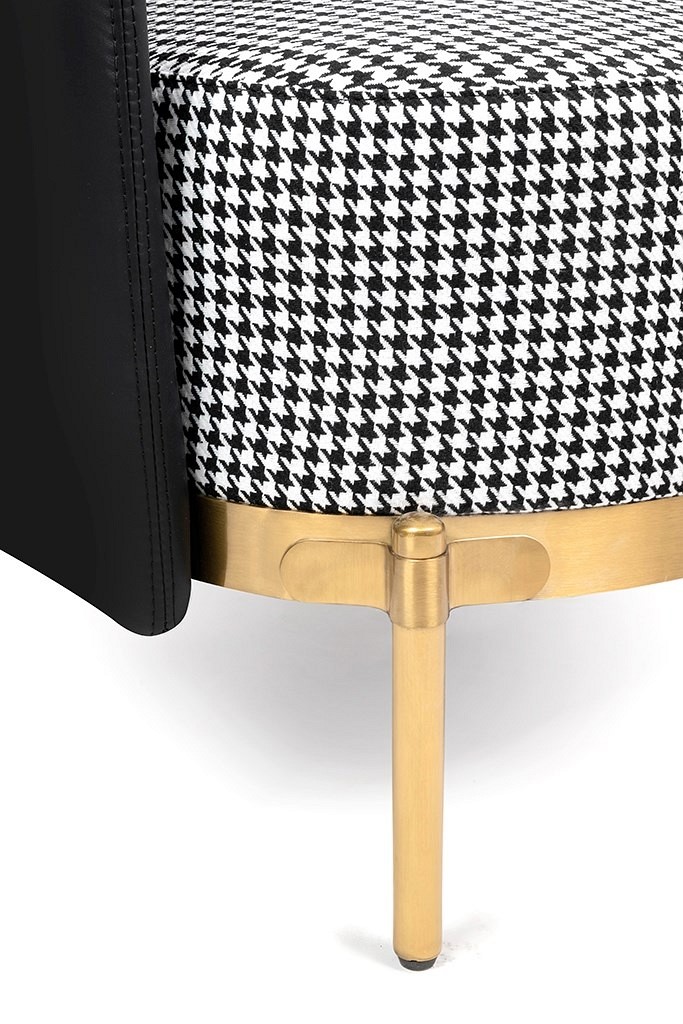 Siedzisko oraz poduszka obszyte jest tkaniną w biało-czarną pepitkę.