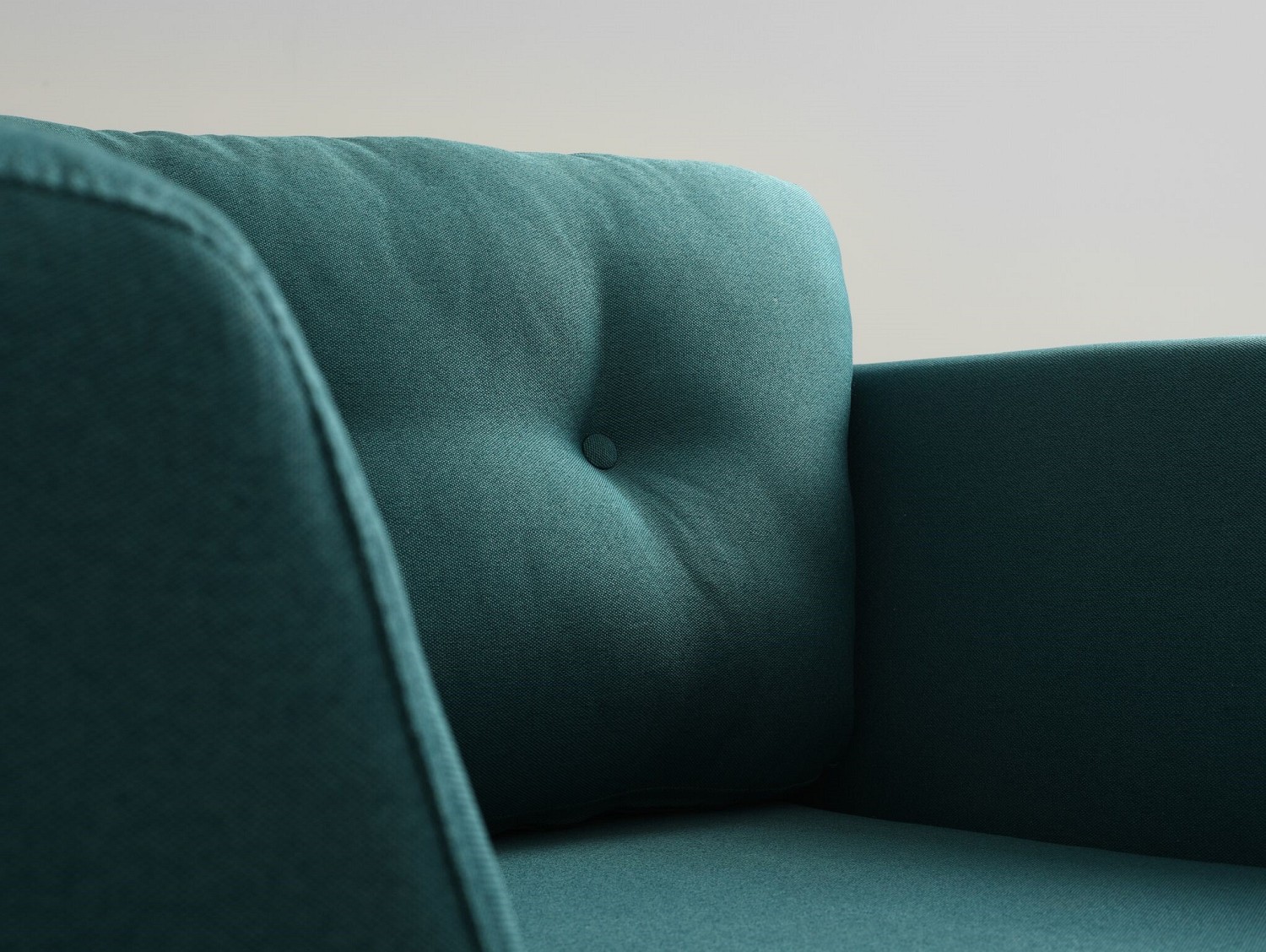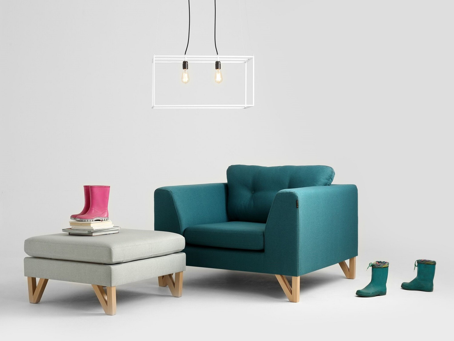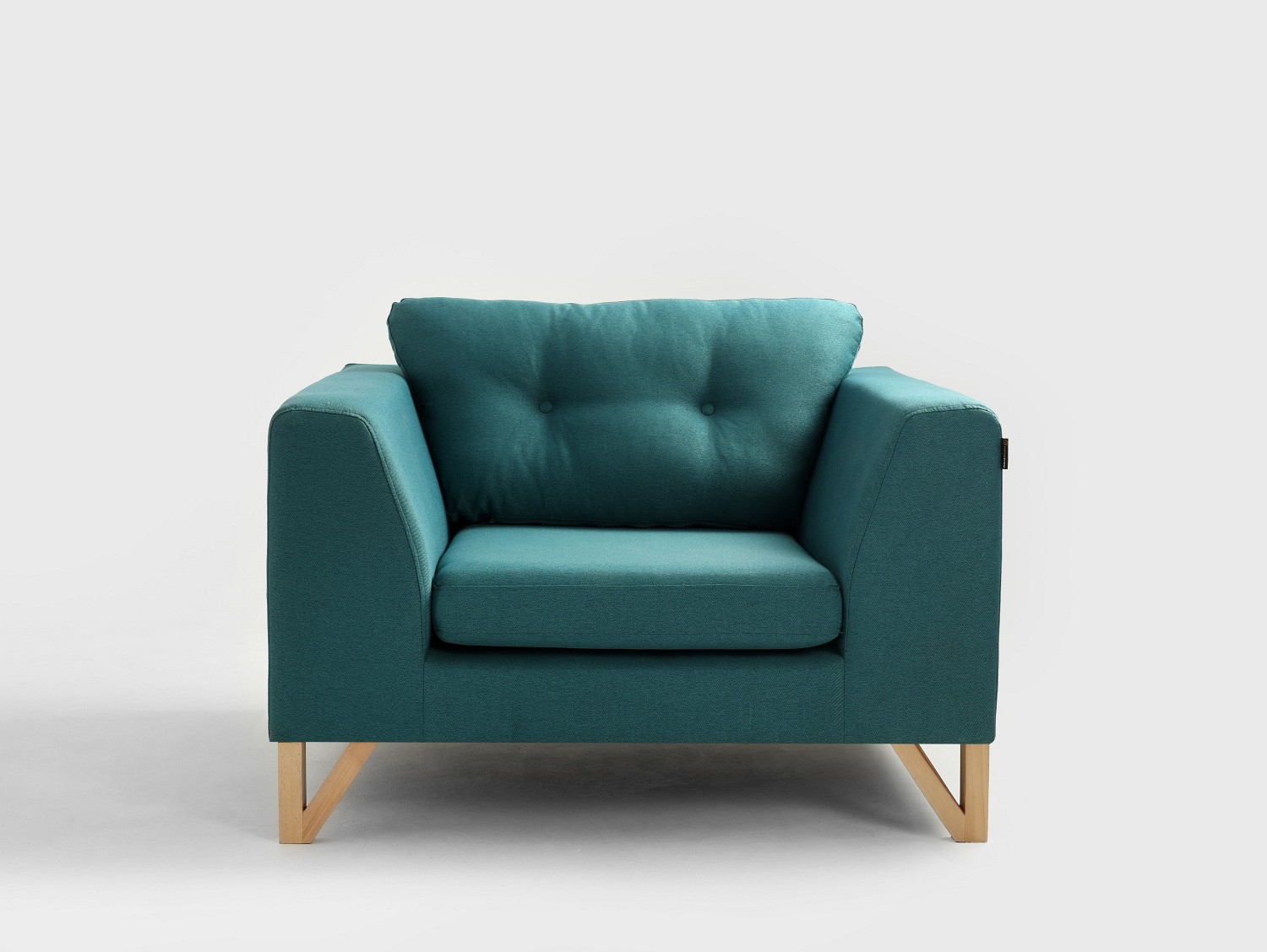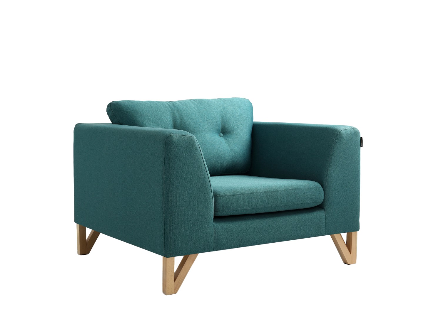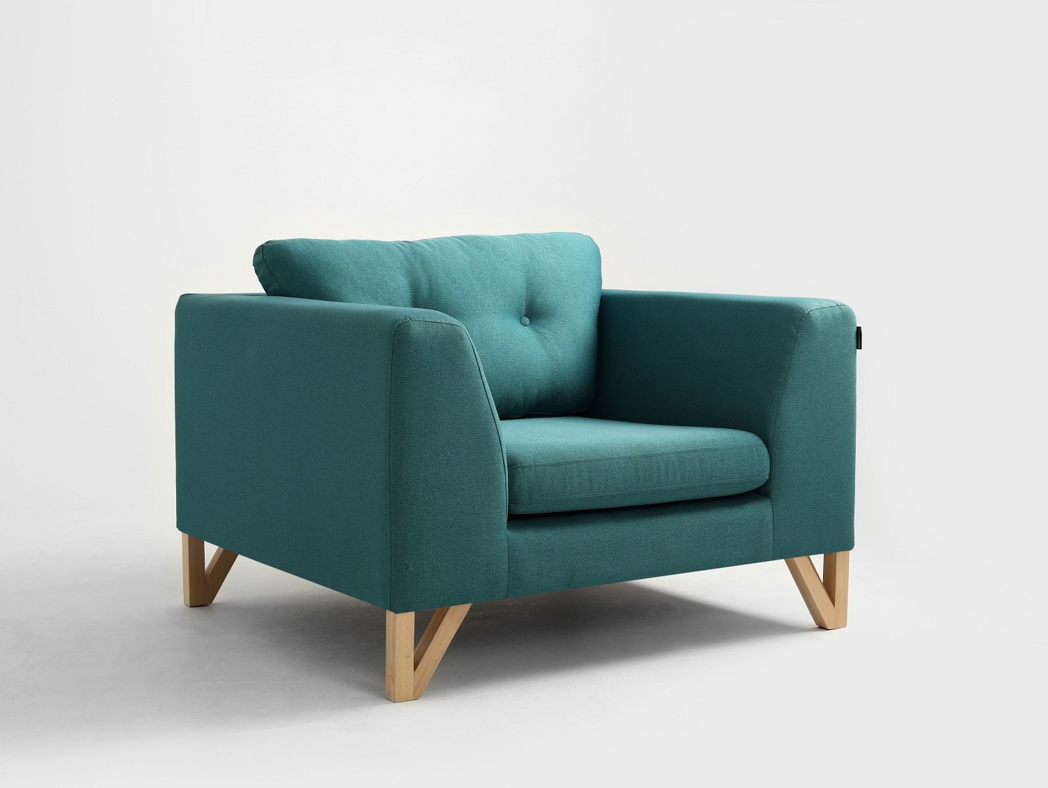 Ten wyjątkowej jakości fotel tapicerowany posiada efektownie wyglądające nogi z litego drewna o jasnej barwie, w kształcie trójkątów, które gwarantują maksymalną stabilność i prezentują się niezwykle elegancko, kontrastując z obiciem w kolorze turkusowym. Mebel posiada szerokie siedzisko wypełnione miękką i odporną na deformację pianką. To bardzo funkcjonalny produkt!
