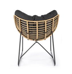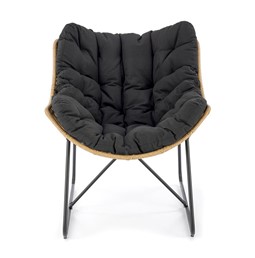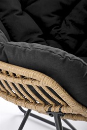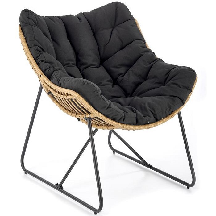 Fotel WHISPER to wygodny mebel, który doskonale sprawdzi się w ogrodzie, a także w pomieszczeniach takich jak salon czy jadalnia. Siedzisko fotela jest utkane z syntetycznego rattanu w kolorze naturalnym, a wyściełana poduszka pokryta jest miękką czarną tkaniną. Podstawę fotela stanowi stabilna konstrukcja wykonana z czarnej stali proszkowej, co zapewnia jego trwałość i wytrzymałość. Profilowane siedzisko fotela WHISPER zostało zaprojektowane tak, aby zapewnić jak najlepszy komfort wypoczynku. Dzięki temu siedzenie w tym fotelu jest bardzo wygodne i odprężające dla ciała.