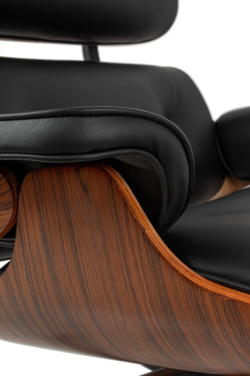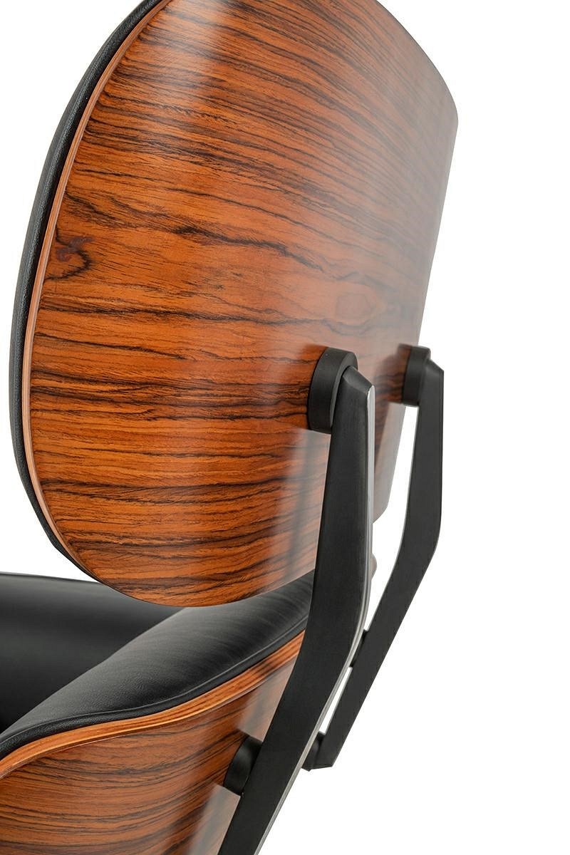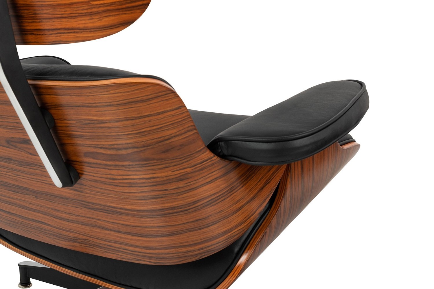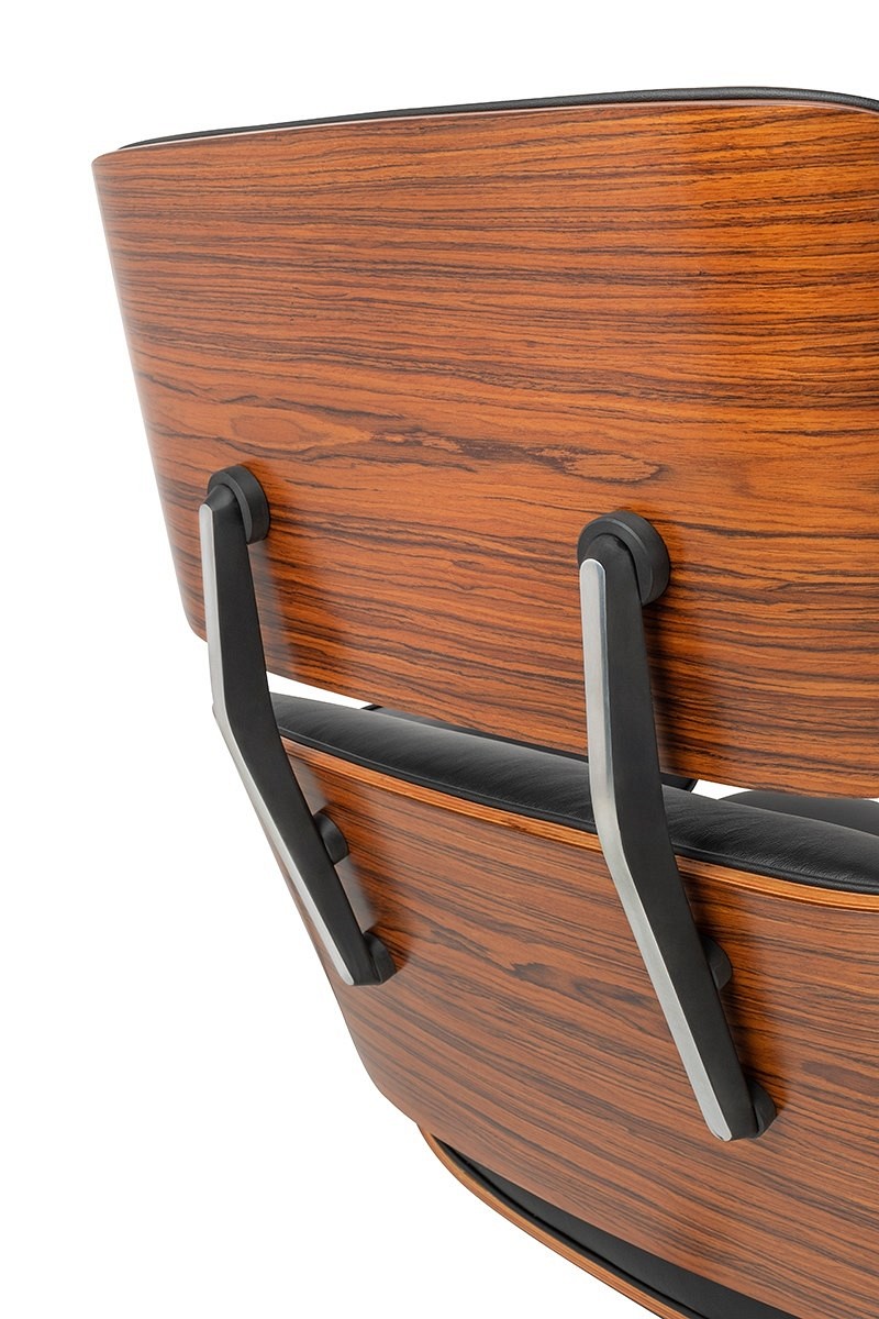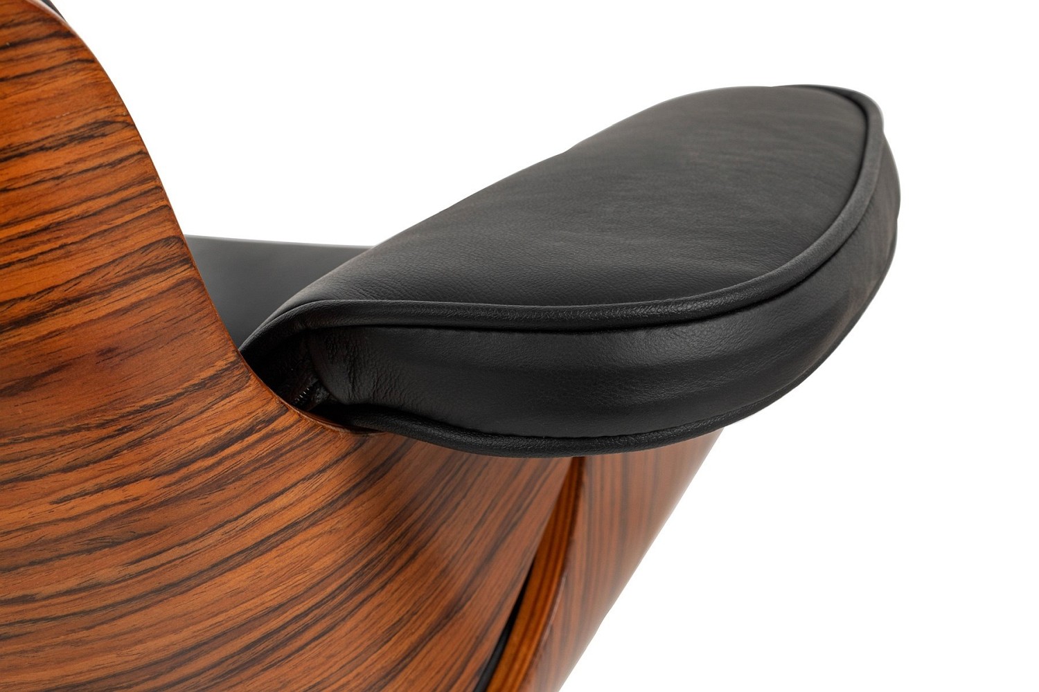 Zarówno korpus fotela jak i podnóżka został wykonany z giętej sklejki fornirowanej drewnem różanym.