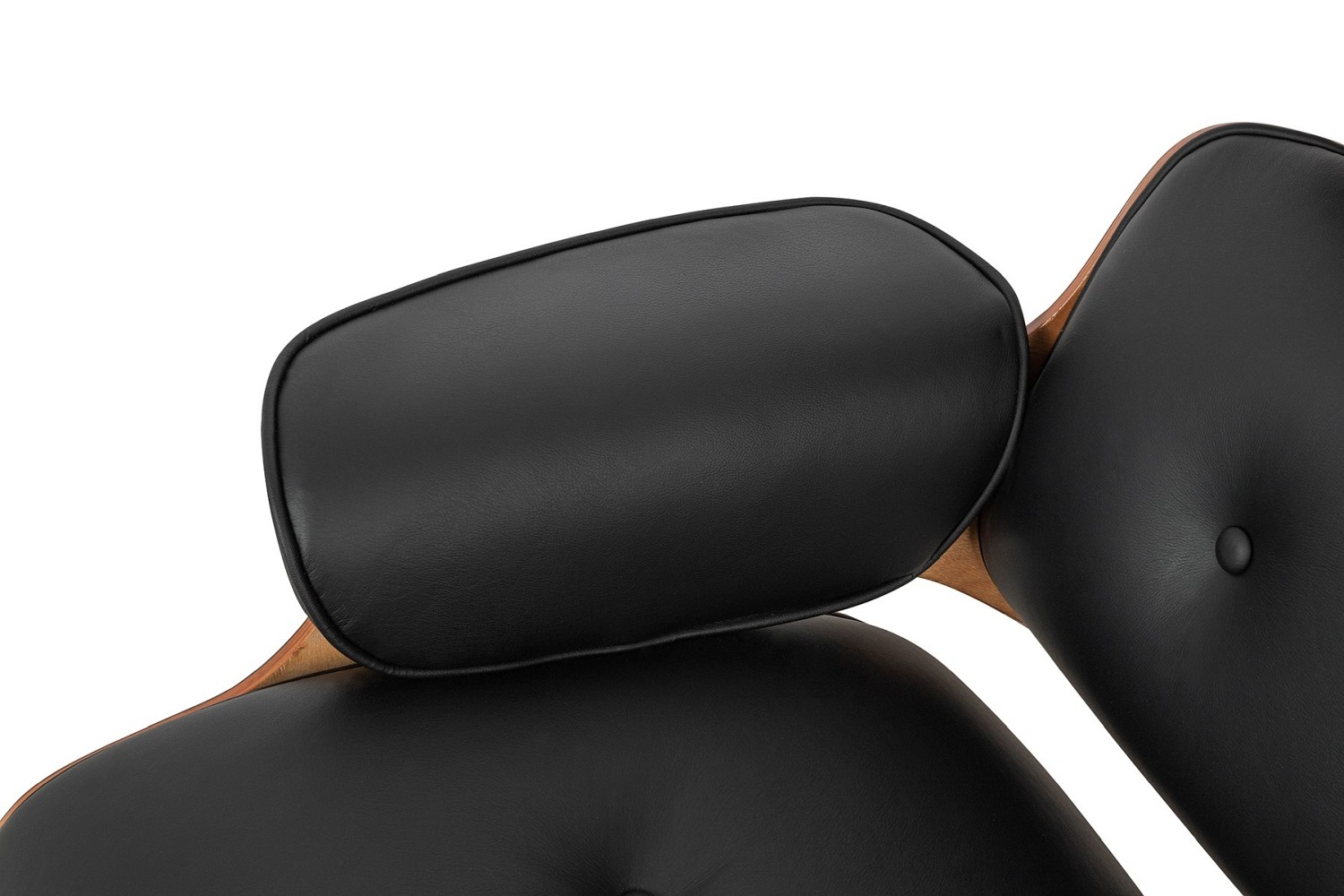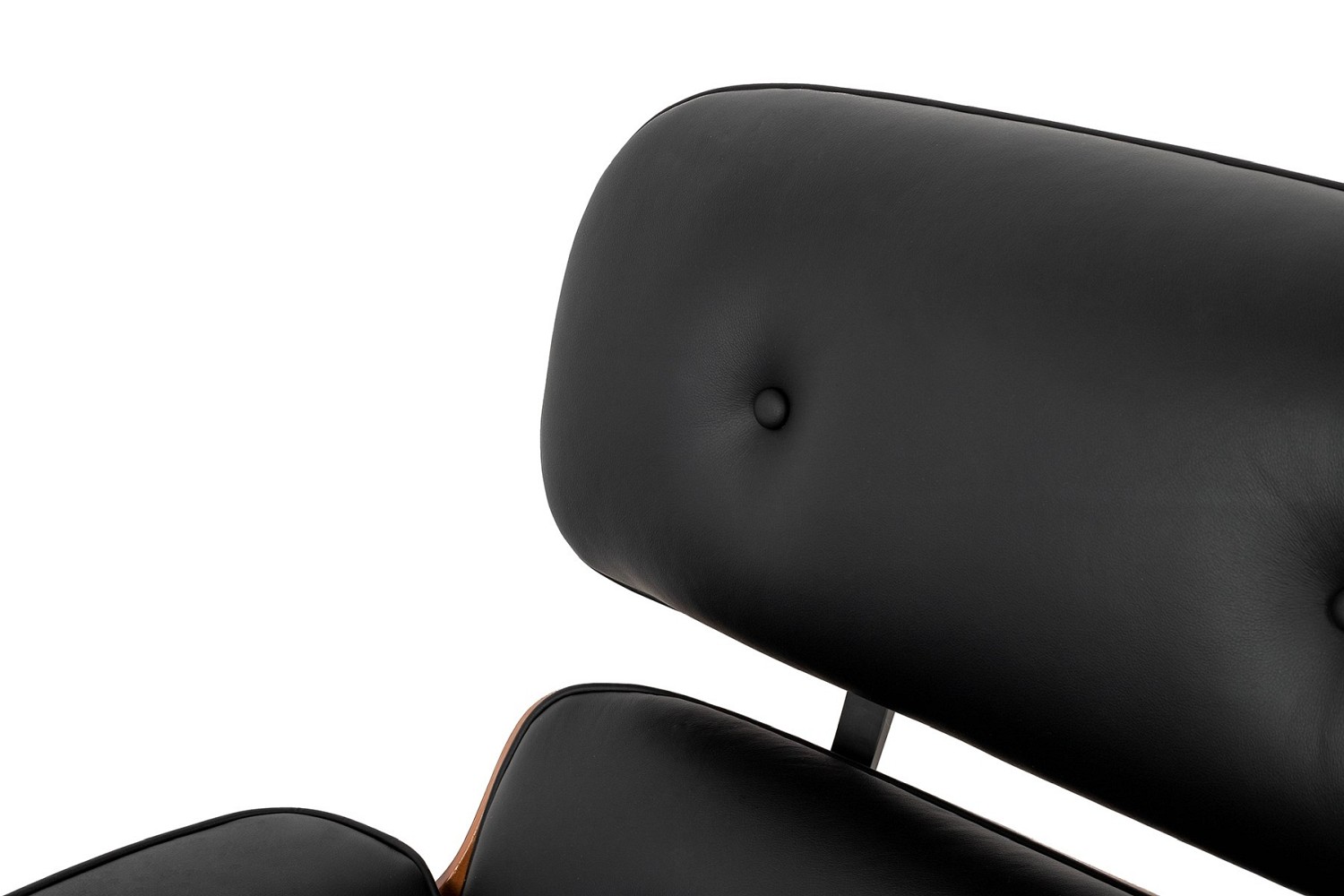 Cały fotel wraz z podnóżkiem tapicerowane są naturalną włoską skórą w kolorze czarnym.