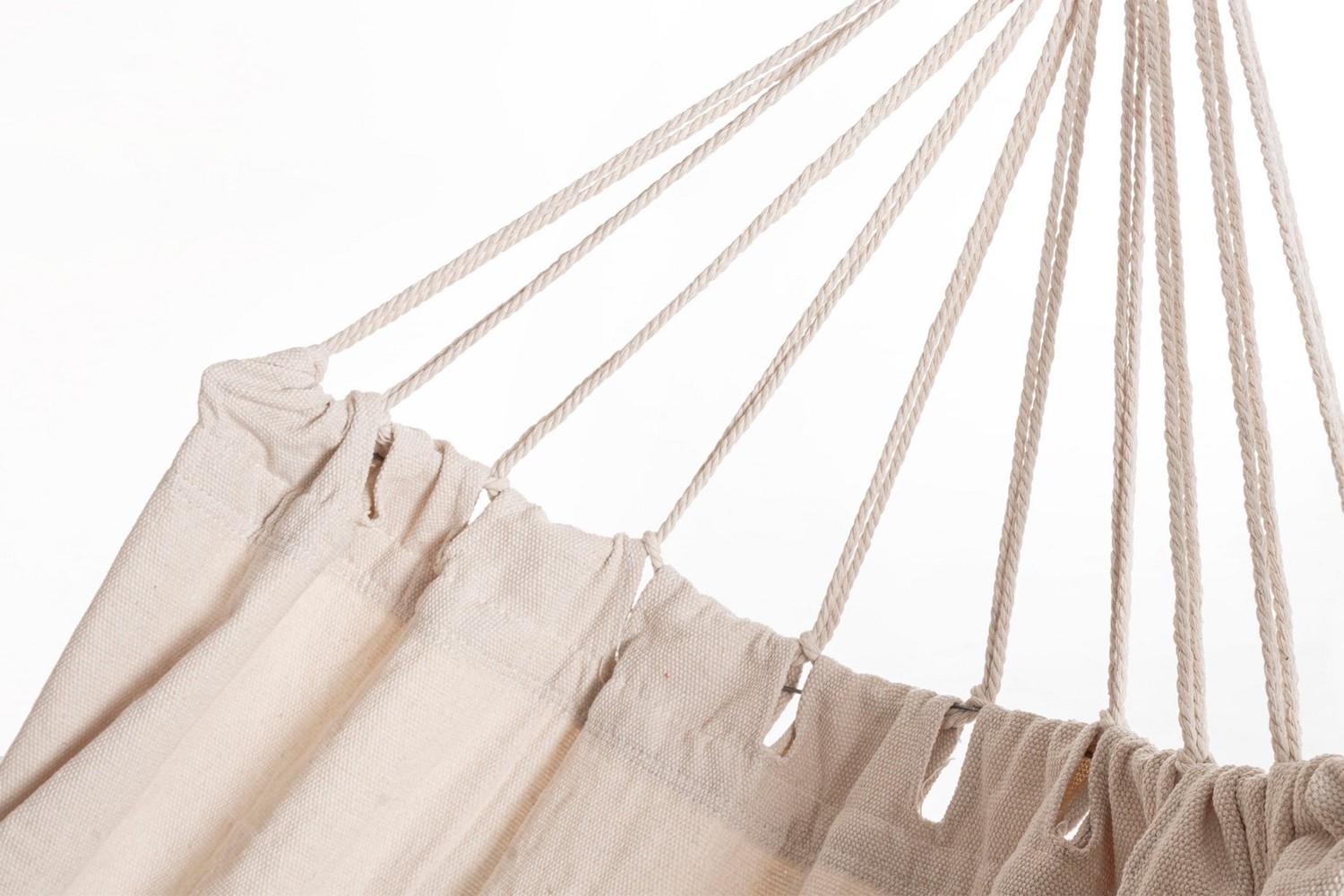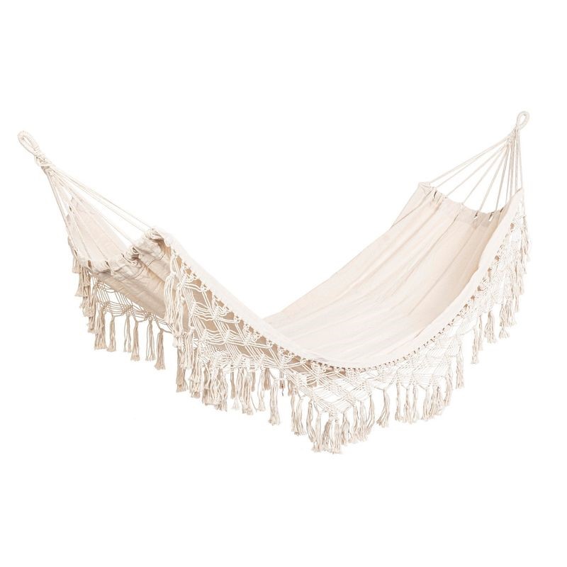 Hamak ELDORIS to kwintesencja letniego relaksu. Dostępny w wersji białej i czarnej, zachwyca prostą, a zarazem dekoracyjną formą. Pleciony z bawełnianego sznurka z ozdobnymi frędzlami, wprowadza atmosferę luzu i wypoczynku. Idealny na taras, balkon, do altany lub ogrodu. Dzięki mocnym uchwytom jest łatwy do zawieszenia. Wprowadzi do przestrzeni odrobinę egzotyki i wygody.