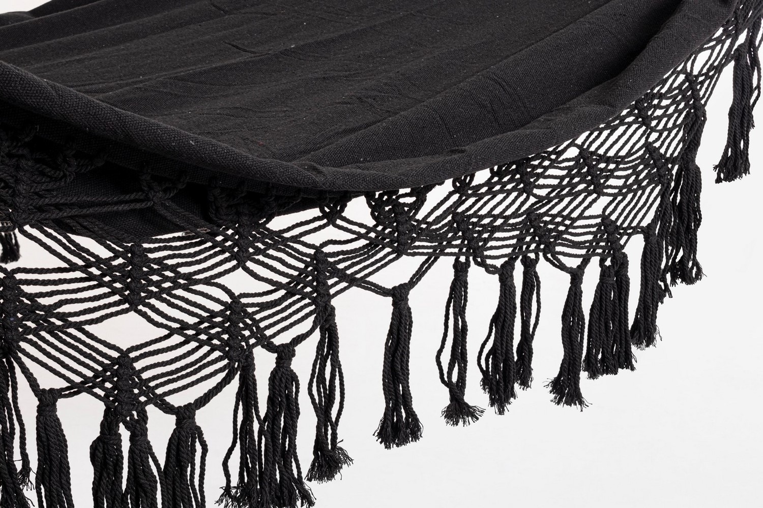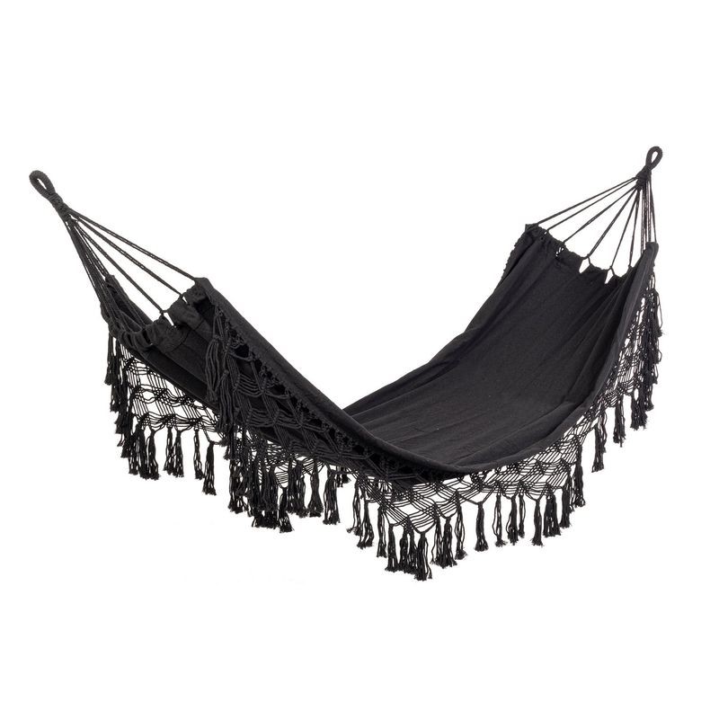 Hamak ELDORIS to kwintesencja letniego relaksu. Dostępny w wersji białej i czarnej, zachwyca prostą, a zarazem dekoracyjną formą. Pleciony z bawełnianego sznurka z ozdobnymi frędzlami, wprowadza atmosferę luzu i wypoczynku. Idealny na taras, balkon, do altany lub ogrodu. Dzięki mocnym uchwytom jest łatwy do zawieszenia. Wprowadzi do przestrzeni odrobinę egzotyki i wygody.