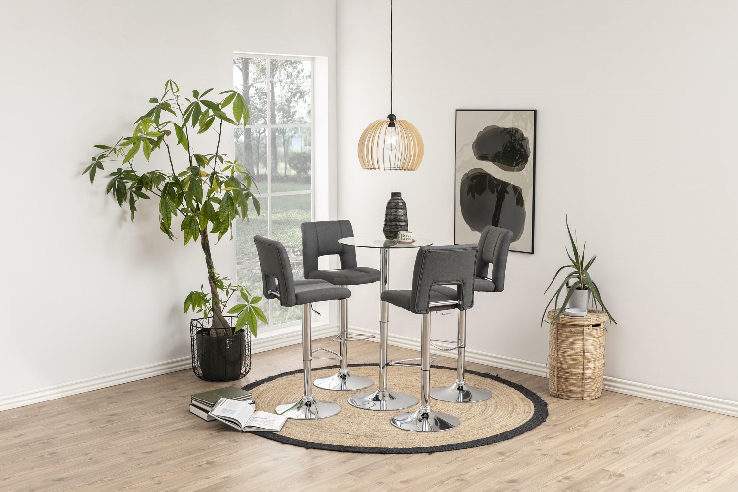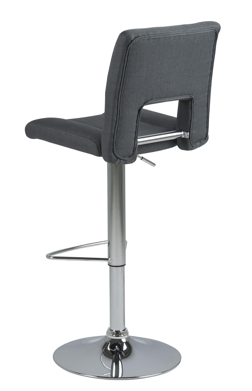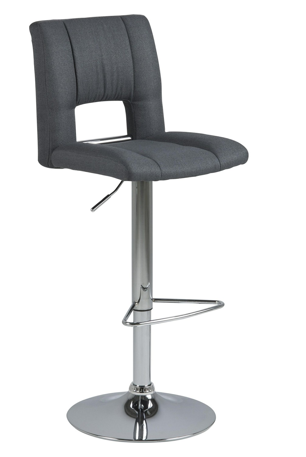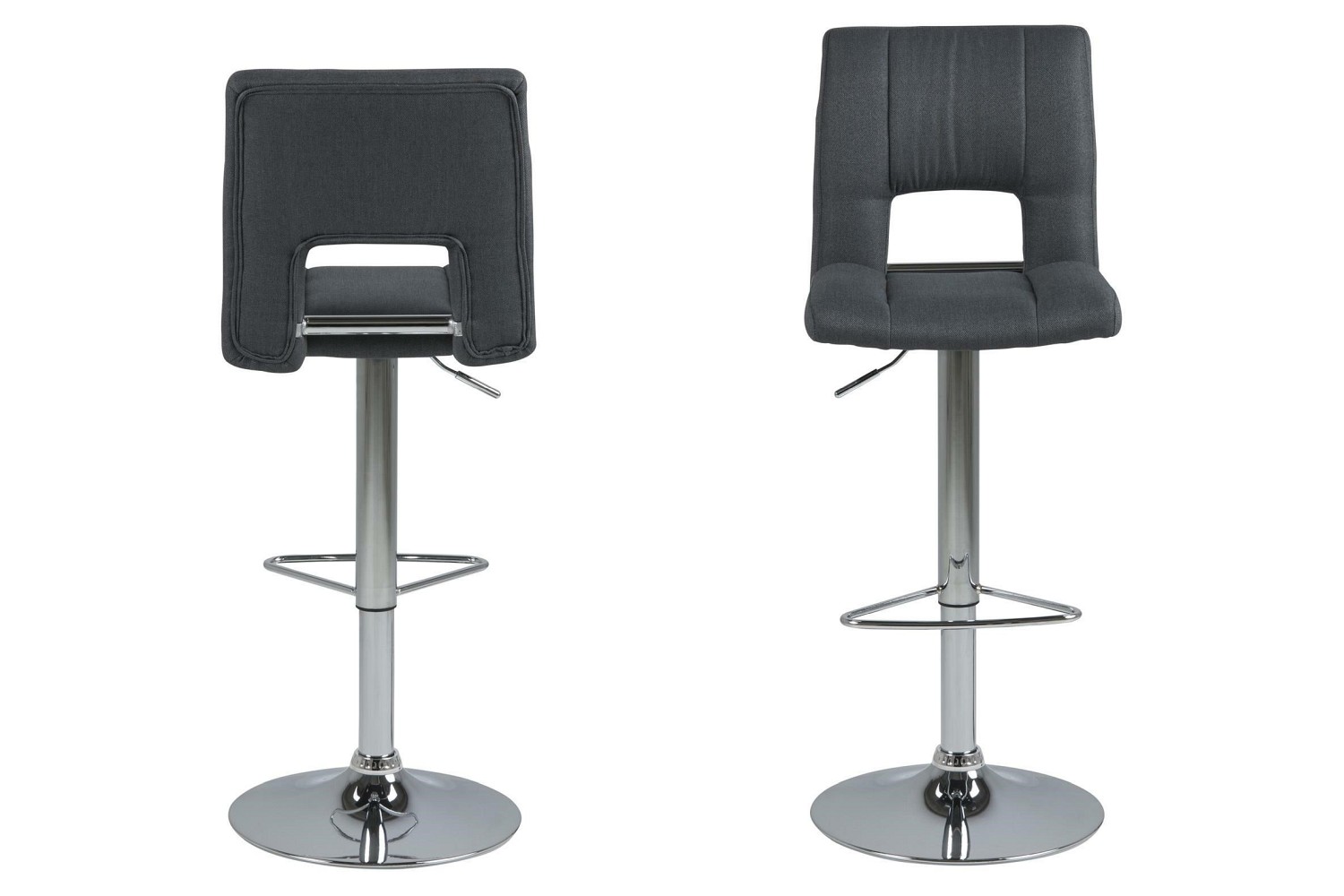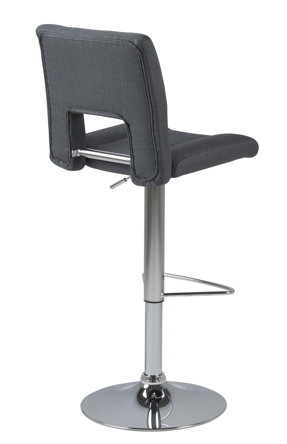 Stołek Sylvia to mebel do nowoczesnego baru lub jadalni. Siedzisko z pianki poliuretanowej pokryte jest antracytową tkaniną. Podstawą jest smukła, długa czarna noga o matowym wykończeniu. Stołek barowy posiada wysokie, wygodne oparcie oraz dodatkowe podparcie nóg. Stołek ma regulowaną wysokość.
