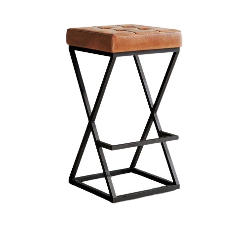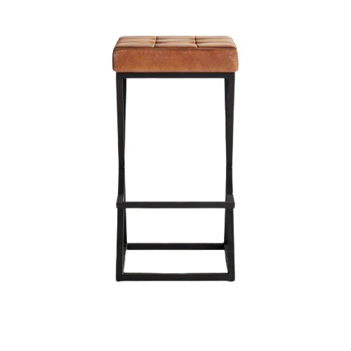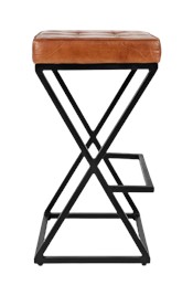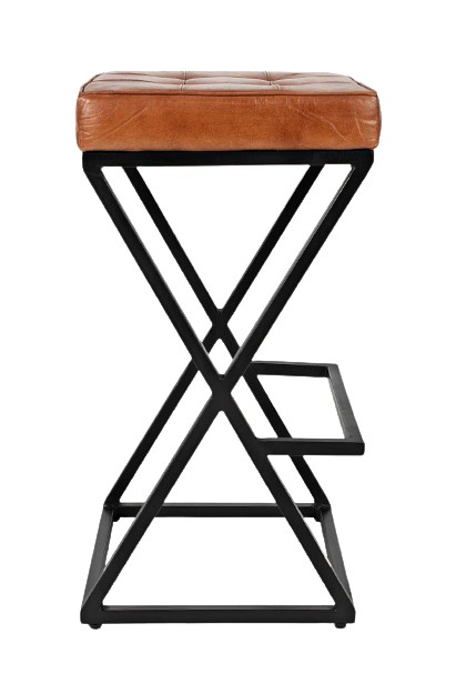 Hoker z pikowanym siedziskiem z naturalnej skóry w kolorze ciemnej wędzonej sieny i czarną konstrukcją w stylu industrialnym. Podstawa taboretu jest kwadratowa, natomiast dwa boki są w kształcie X. Całość jest ze sobą połączona tworząc ciekawy kształt, dodatkowo taboret posiada praktyczny podnóżek będący integralną częścią całości. Hokery idealnie wpasują się w nowoczesne wnętrze.