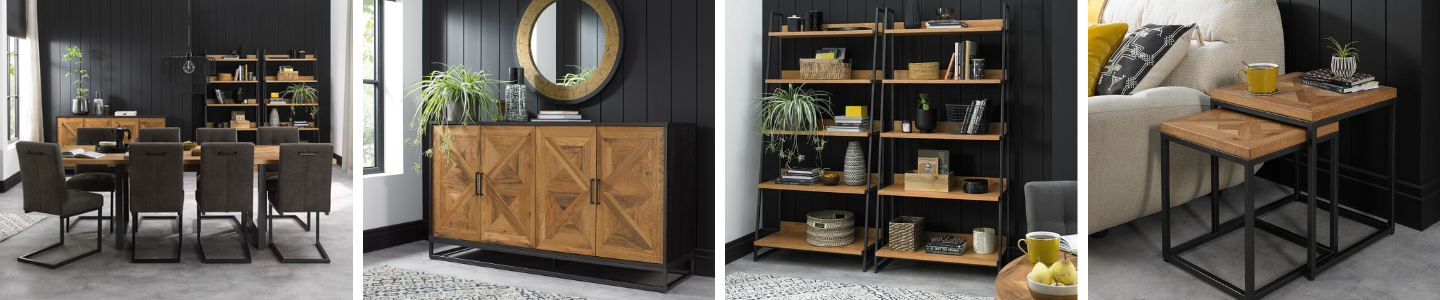 Kolekcja Indus to meble w stylu loftowym i industrialnym, łączące prostą formę stalowej, ciemno-grafitowej konstrukcji oraz naturalnych drewnianych blatów, a także frontów z niezwykłym zdobieniem w postaci intarsji.