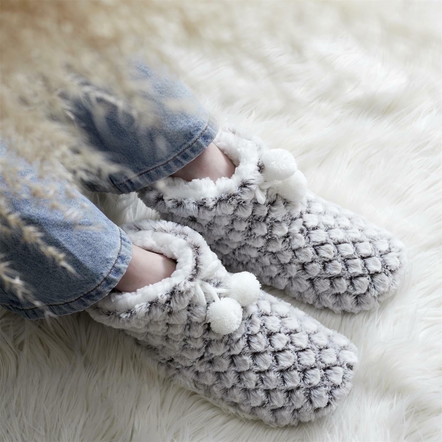 Te szare kapcie z uroczymi pomponami to praktyczne i estetyczne rozwiązanie na zimowe wieczory. Wykonane z miękkiego, przyjemnego materiału, zapewniają ciepło i komfort podczas codziennego użytkowania.