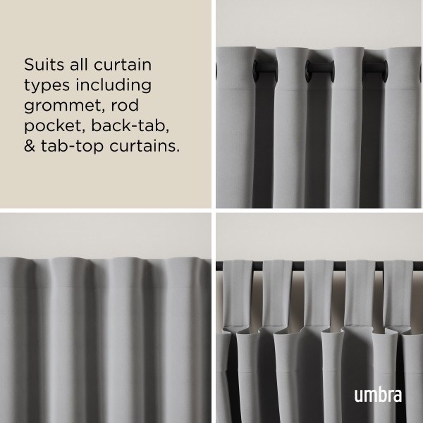 Karnisz TWILIGHT od Umbra to doskonały wybór dla osób ceniących nowoczesny minimalizm. Jego końce przylegają bezpośrednio do ściany, co pozwala na skuteczne ograniczenie dopływu światła po bokach zasłony. Dzięki regulowanej długości sprawdzi się w różnych przestrzeniach – od salonu po sypialnię.