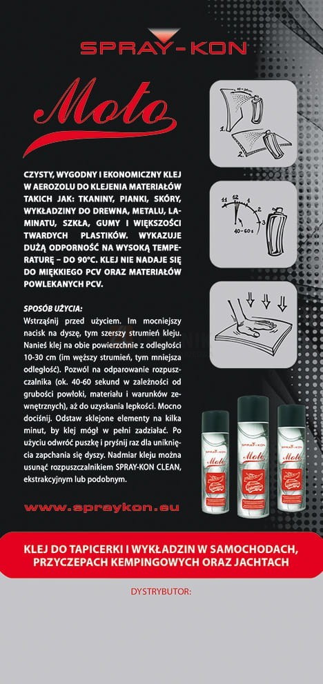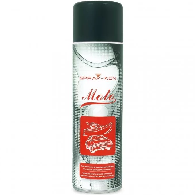 - SPRAY-KON MOTO to klej idealny do przyklejania podsufitek, pianek, tkanin, wykładzin