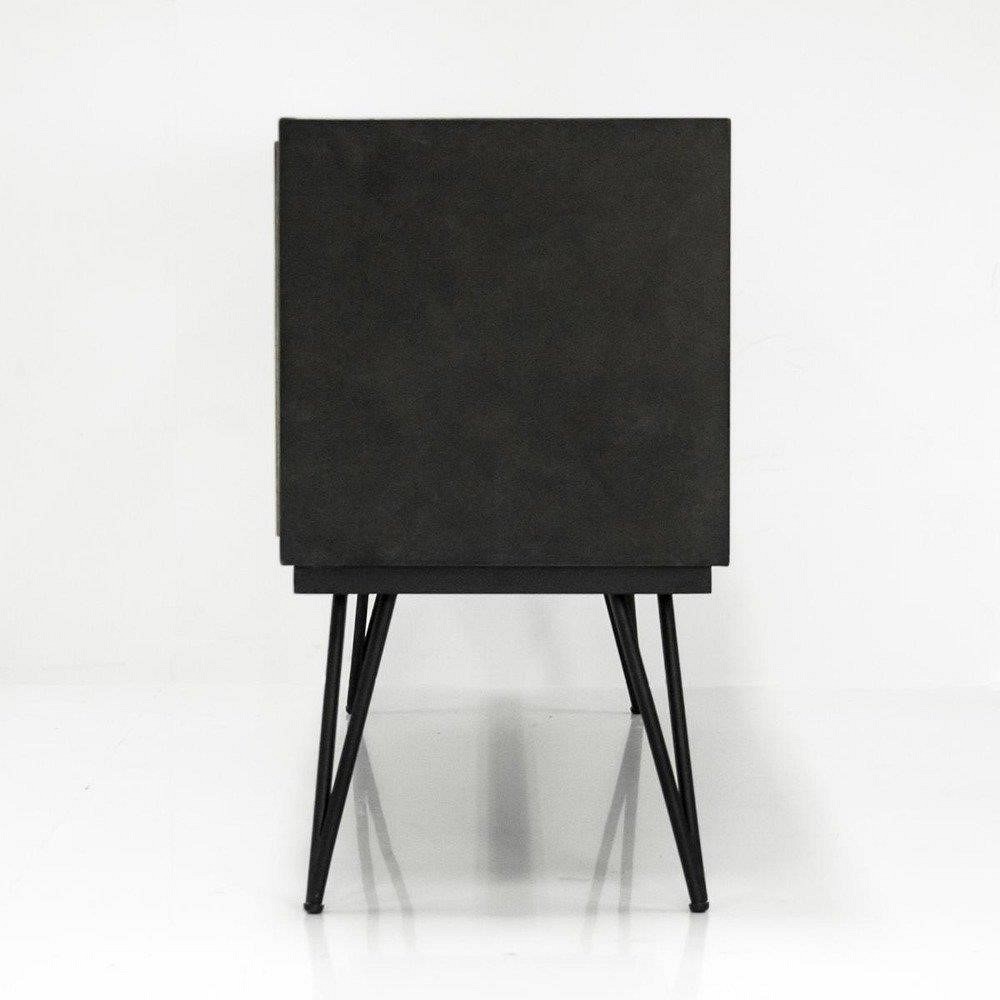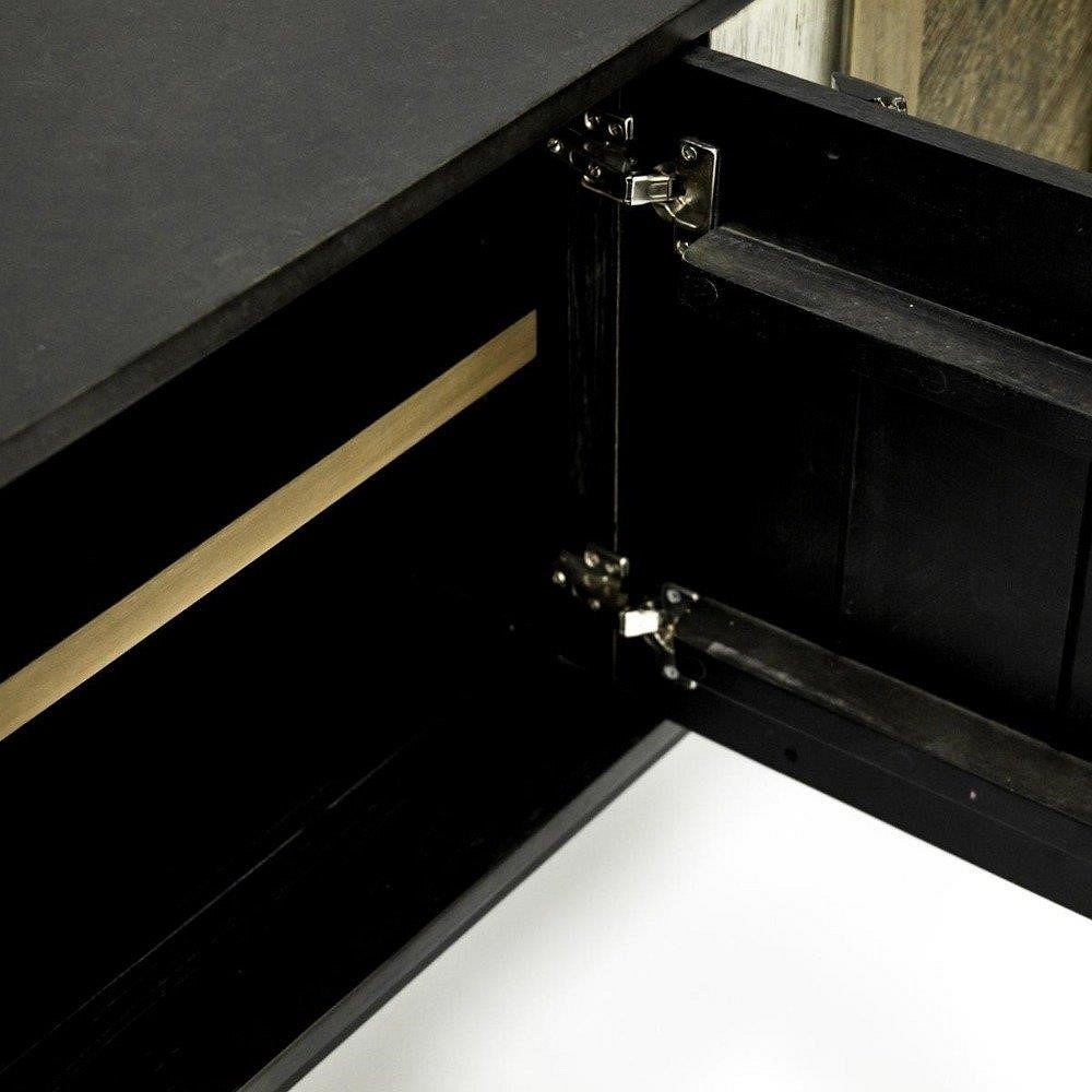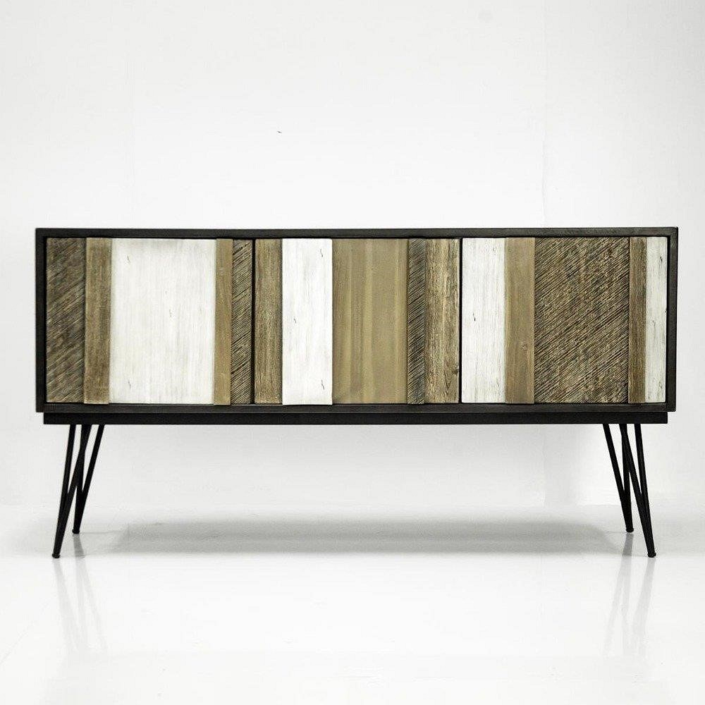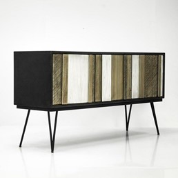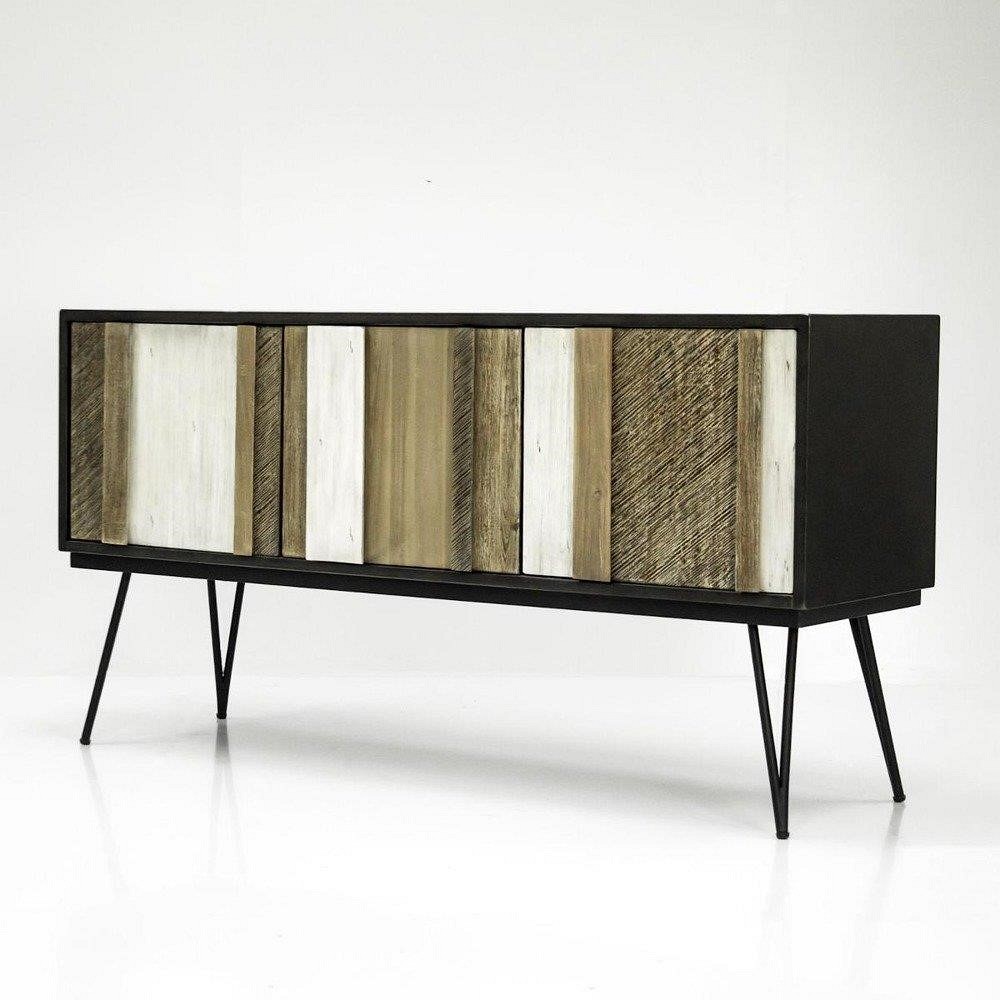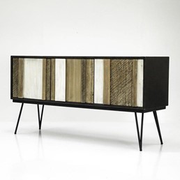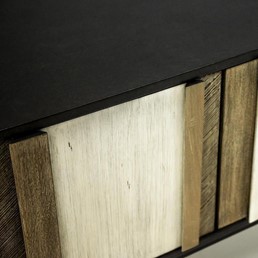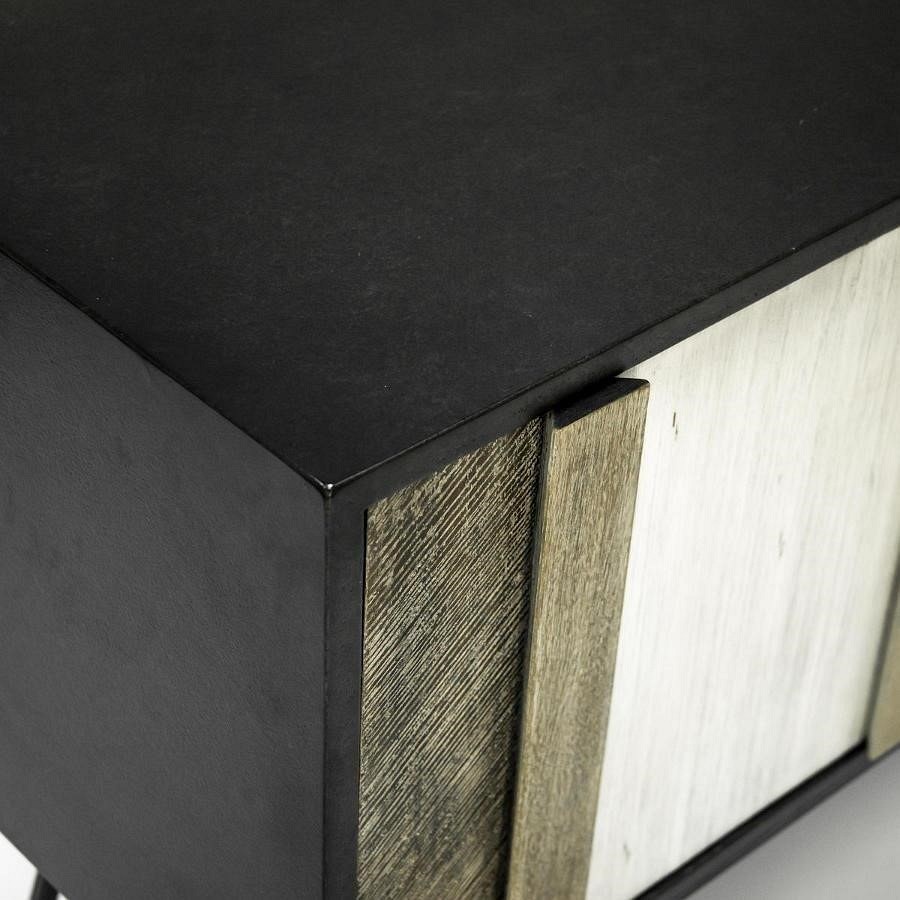 Komoda w stylu retro z oryginalnym frontem z litego drewna w różnych odcieniach. Fronty mają fakturę 3D i inną fakturę powierzchni drewna, pełnią również funkcję uchwytu na krawędzi. Szafa z czarnymi metalowymi nogami. Czarny korpus z płyty MDF idealnie komponuje się z szaro-beżowym panelem przednim. Komoda posiada dwie półki i drzwi.
