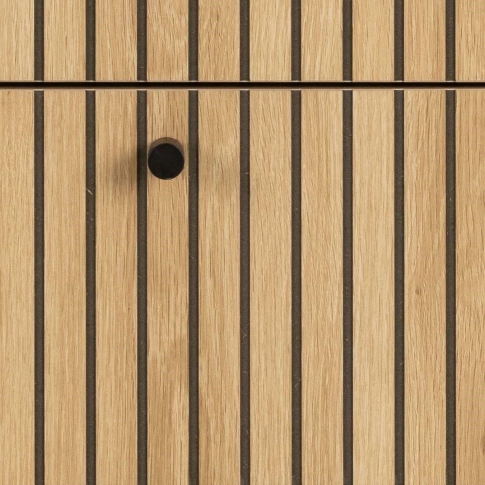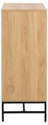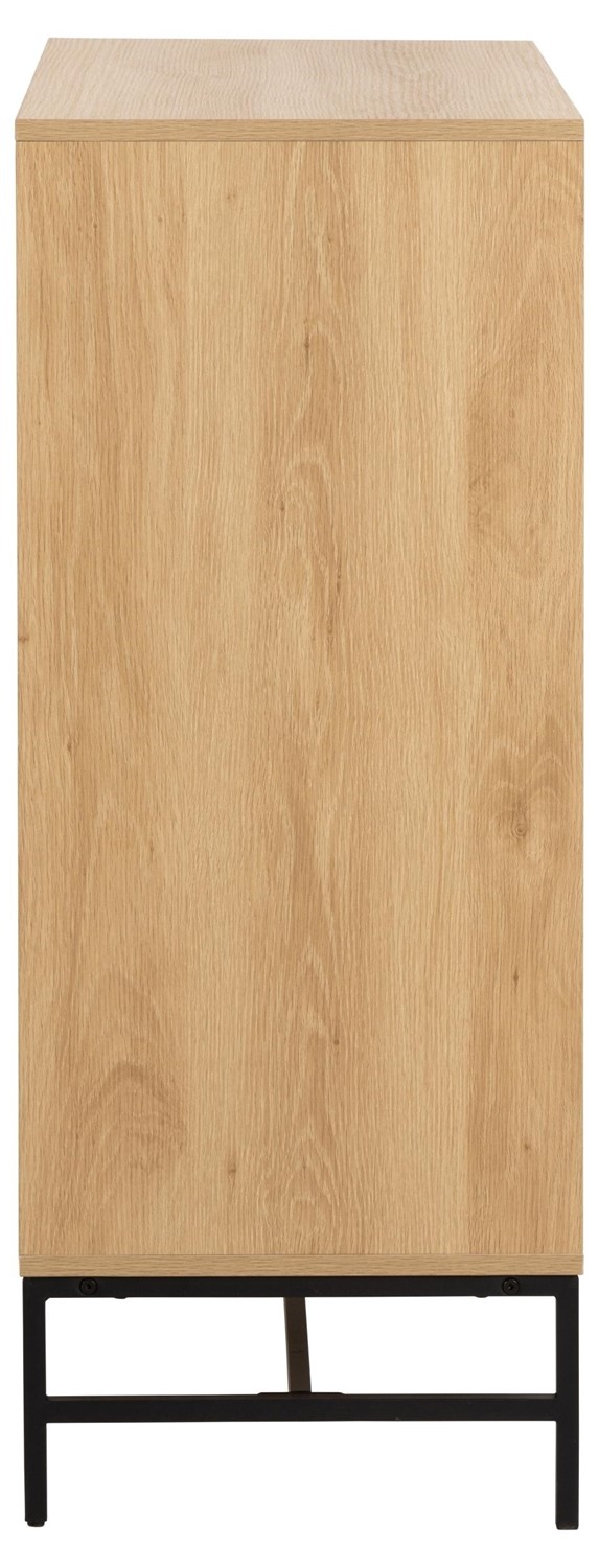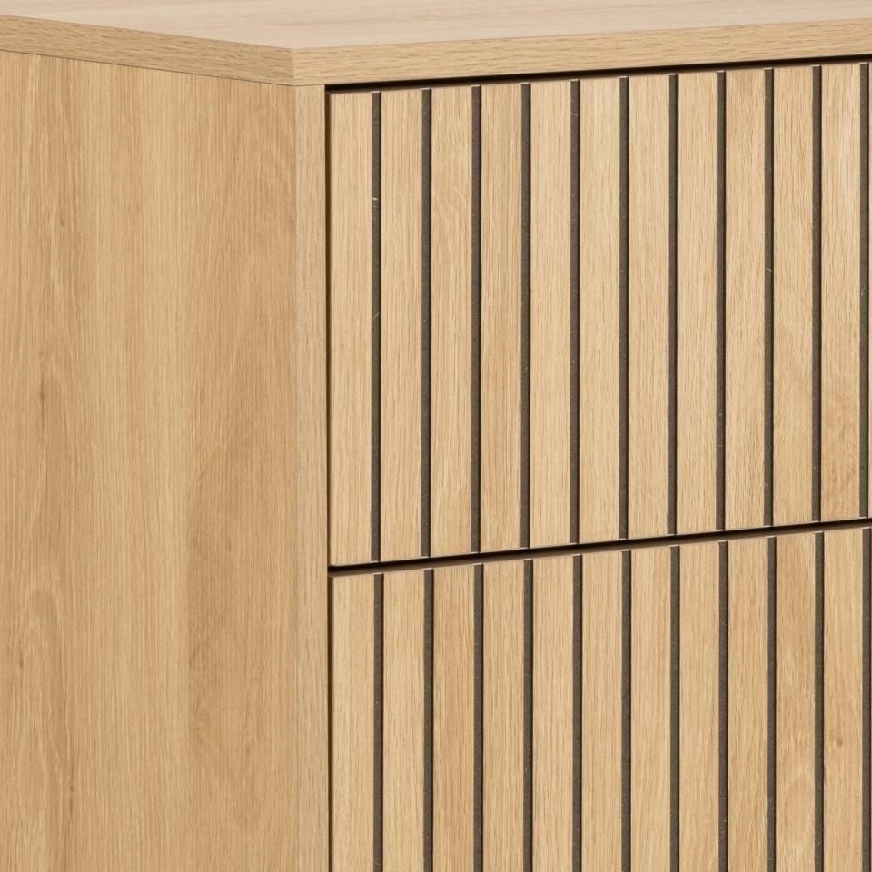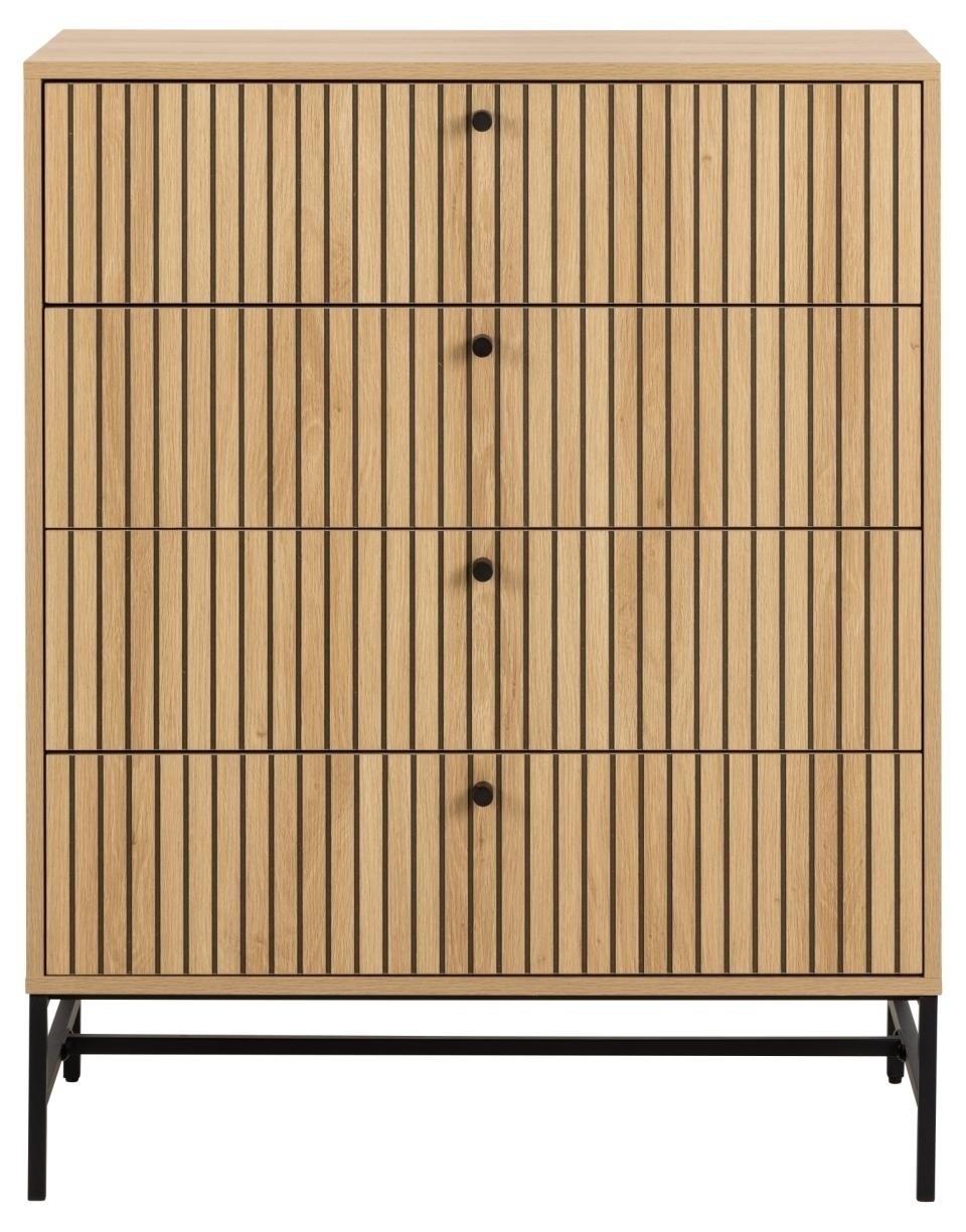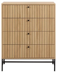 Komoda o dębowym wyglądzie z lamelowym frontem łączy elegancję z funkcjonalnością. Jej kontrastowy wygląd w połączeniu z czarnymi akcentami tworzy harmonijną całość, a cztery pojemne szuflady zapewniają odpowiednią przestrzeń do przechowywania. Wykonana z dbałością o detale, będzie pasować do każdego nowoczesnego wnętrza.