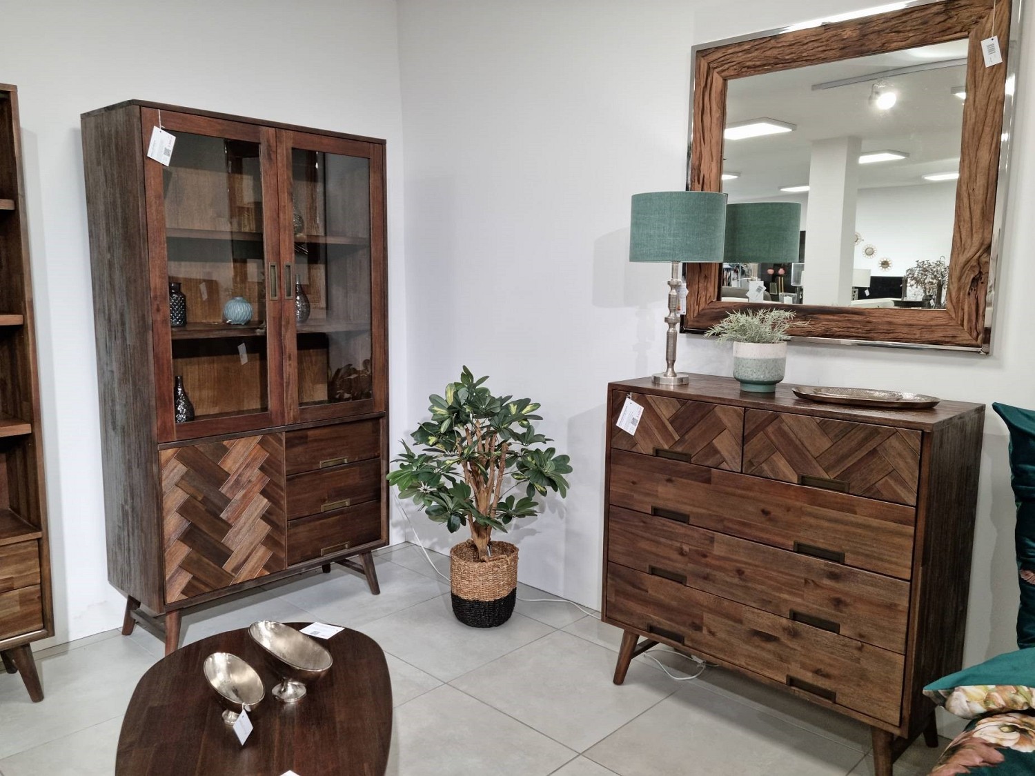Stylowa i elegancka drewniana komoda w stylu retro o pięknym brązowym zabarwieniu z uchwytami w kolorze mosiądzu. Komoda posiada sześć szuflad w tym dwie górne z intarsją.