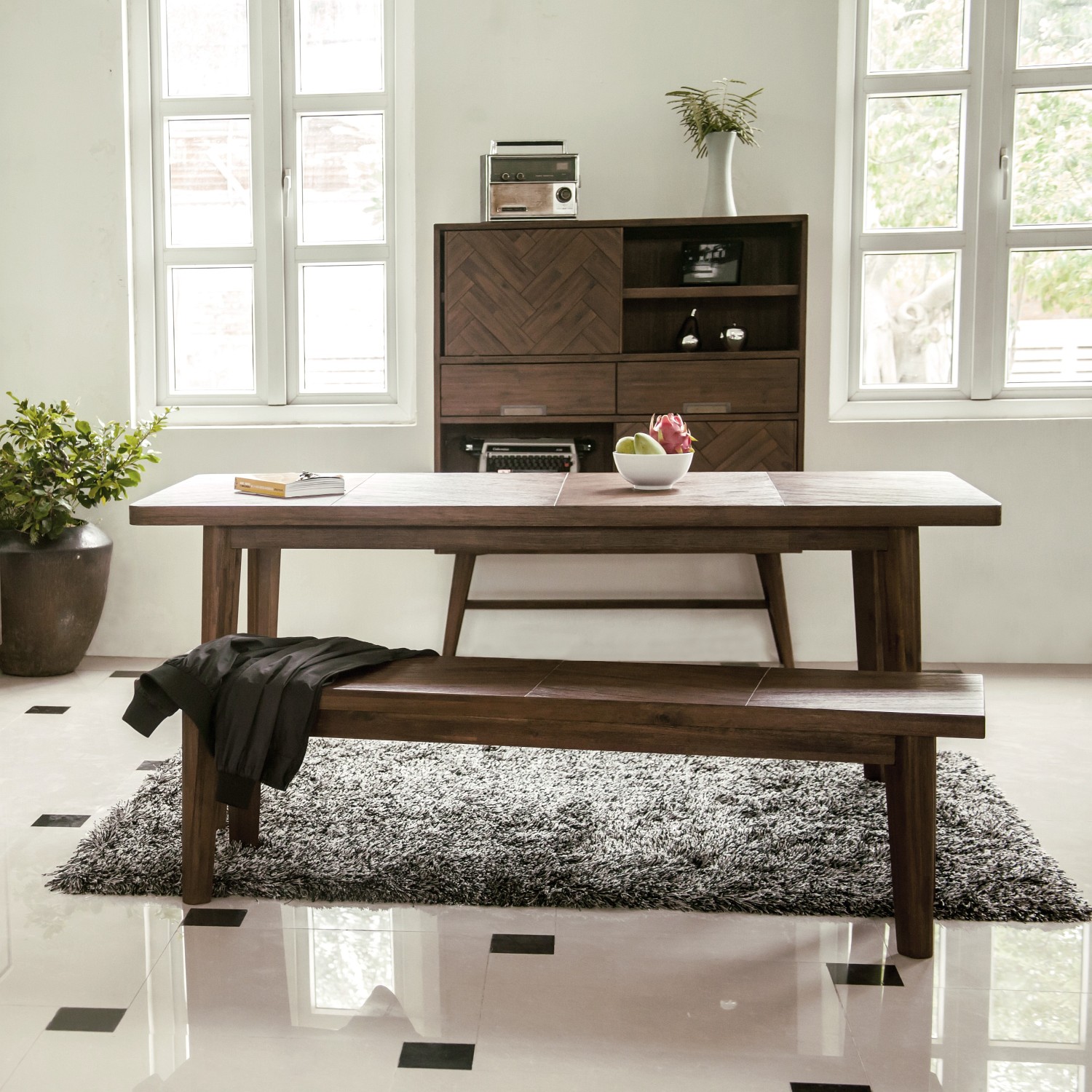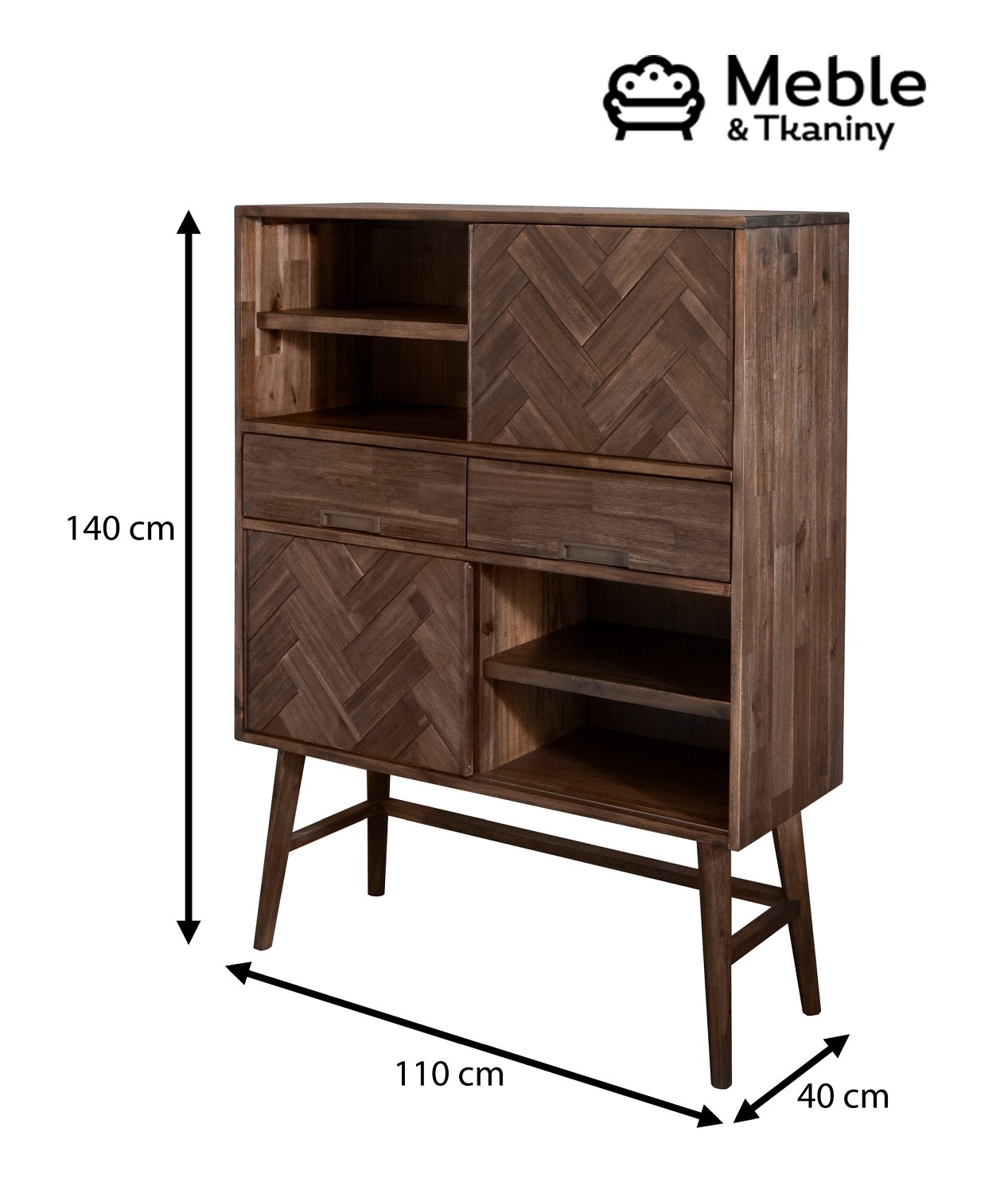 ASHTON, czyli przykuwające uwagę detale. Klasyczne, ciemnobrązowe drewno akacji, z którego wykonano szafkę, wyróżnia się niezwykłą strukturą ułożenia poszczególnych desek. Mimo, iż zdają się być jednakowymi elementami, ich ułożenie tworzy coś na kształt plecionki. To ona zapewnia wyjątkowy charakter mebla. Wnętrze składa się z niskich półek i szuflad z delikatnymi, złotymi uchwytami. Stanowi stylowe miejsce do przechowywania dekodera czy ulubionych filmów.