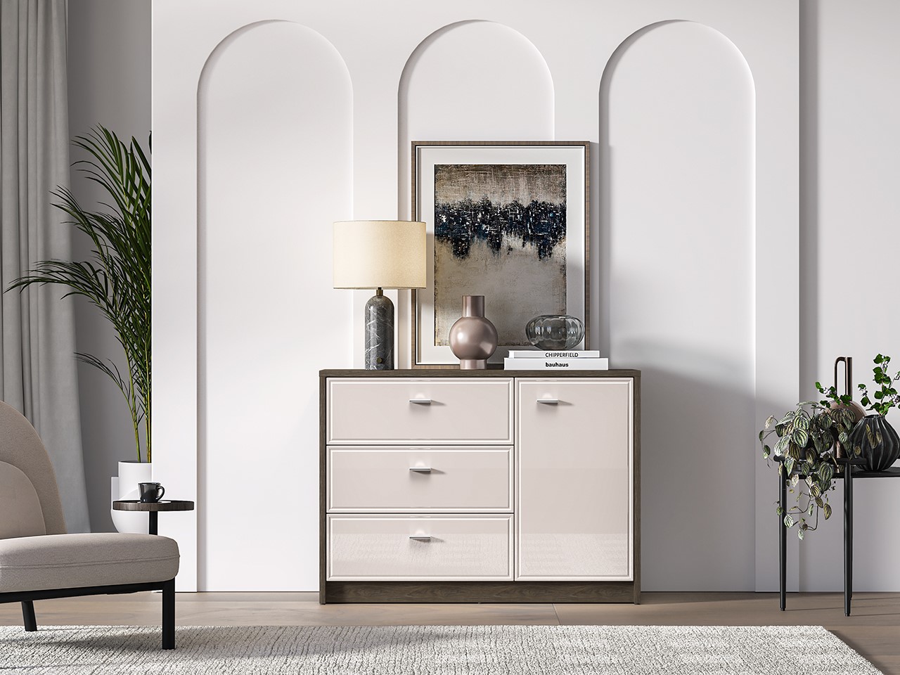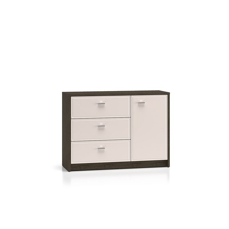 Komody z serii TOSCANIA są idealnym rozwiązaniem do przechowywania w eleganckim stylu. Dzięki połączeniu szuflad i zamykanych szafek oferują sporo miejsca na ubrania, dokumenty czy akcesoria. Frezowane fronty i klasyczne uchwyty podkreślają tradycyjny charakter mebla.
