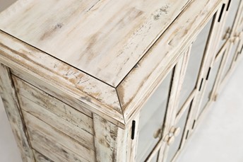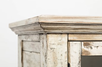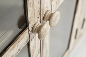 Kremowa komoda w stylu rustykalnym to harmonijne połączenie wiejskiego uroku z subtelnością. Charakterystyczne postarzenia i ozdobne listewki nadają jej autentycznego charakteru. Przeszklone drzwi i frezowany blat dodają elegancji, umożliwiając jednocześnie eksponowanie ulubionych przedmiotów. To nie tylko praktyczne rozwiązanie do przechowywania, ale także unikalny element dekoracyjny, który wnosi do wnętrza ciepło i styl.