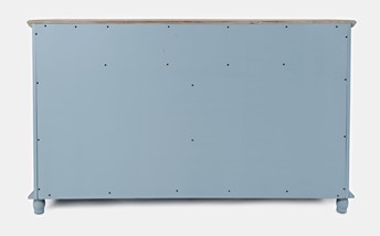 Ta wyjątkowa komoda łączy w sobie solidność, funkcjonalność i urok designu, tworząc harmonijną całość. Wykonana z wysokiej jakości drewna akacji i MDF-u, zapewnia trwałość i elegancję, której nie można przeoczyć. Jasnoniebieski kolor korpusu nadaje meblowi delikatności i świeżości, tworząc w pomieszczeniu przyjemną atmosferę. Jasnobrązowy blat stanowi elegancki kontrast, dodając komodzie wyrazistego charakteru i klasy. Komoda wyposażona jest w dwie praktyczne szuflady, idealne do przechowywania drobiazgów, oraz dwie półki, umożliwiające efektowne wyeksponowanie przedmiotów. Przeszklone ażurowe drzwi dodają meblowi subtelnego szyku, pozwalając jednocześnie zachować lekkość i przewiewność wizualną.
