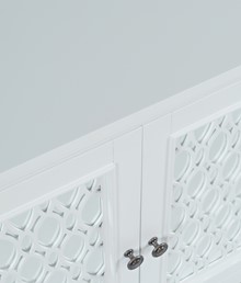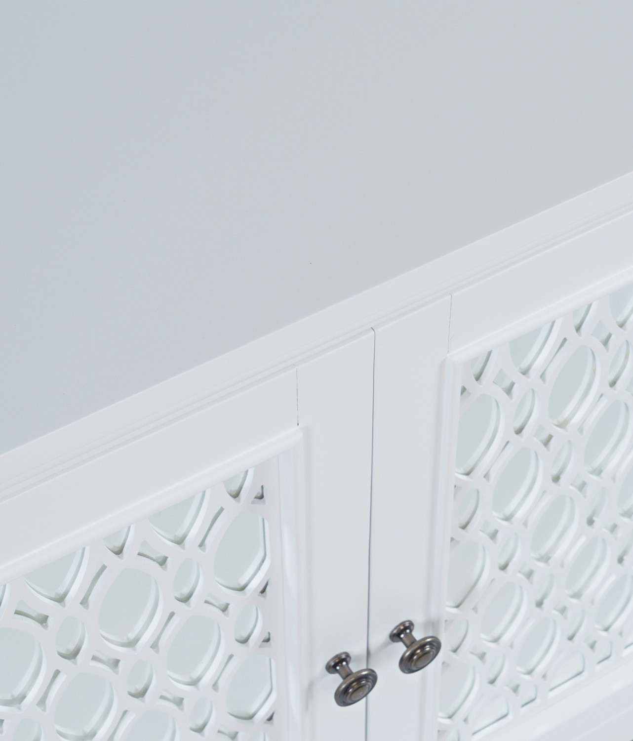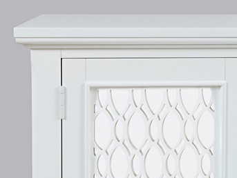 Komoda, która nie tylko przechowuje, ale także odbija piękno swojego otoczenia. Wykonana z drewna akacji i MDF-u, ta komoda prezentuje się w eleganckim kolorze białym, wprowadzając do wnętrza lekkość i świeżość. Dwoje lustrzanych ażurowych drzwiczek dodaje komodzie delikatności i subtelności, a jednocześnie optycznie powiększa przestrzeń. To nietuzinkowe rozwiązanie, które nadaje meblowi wyjątkowego charakteru. Komoda nie tylko utrzymana w nowoczesnym designie, ale także praktyczna dzięki jednej półce, która oferuje dodatkową przestrzeń do przechowywania. Wykorzystanie drewna akacji i MDF-u gwarantuje trwałość i solidność konstrukcji.