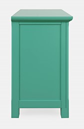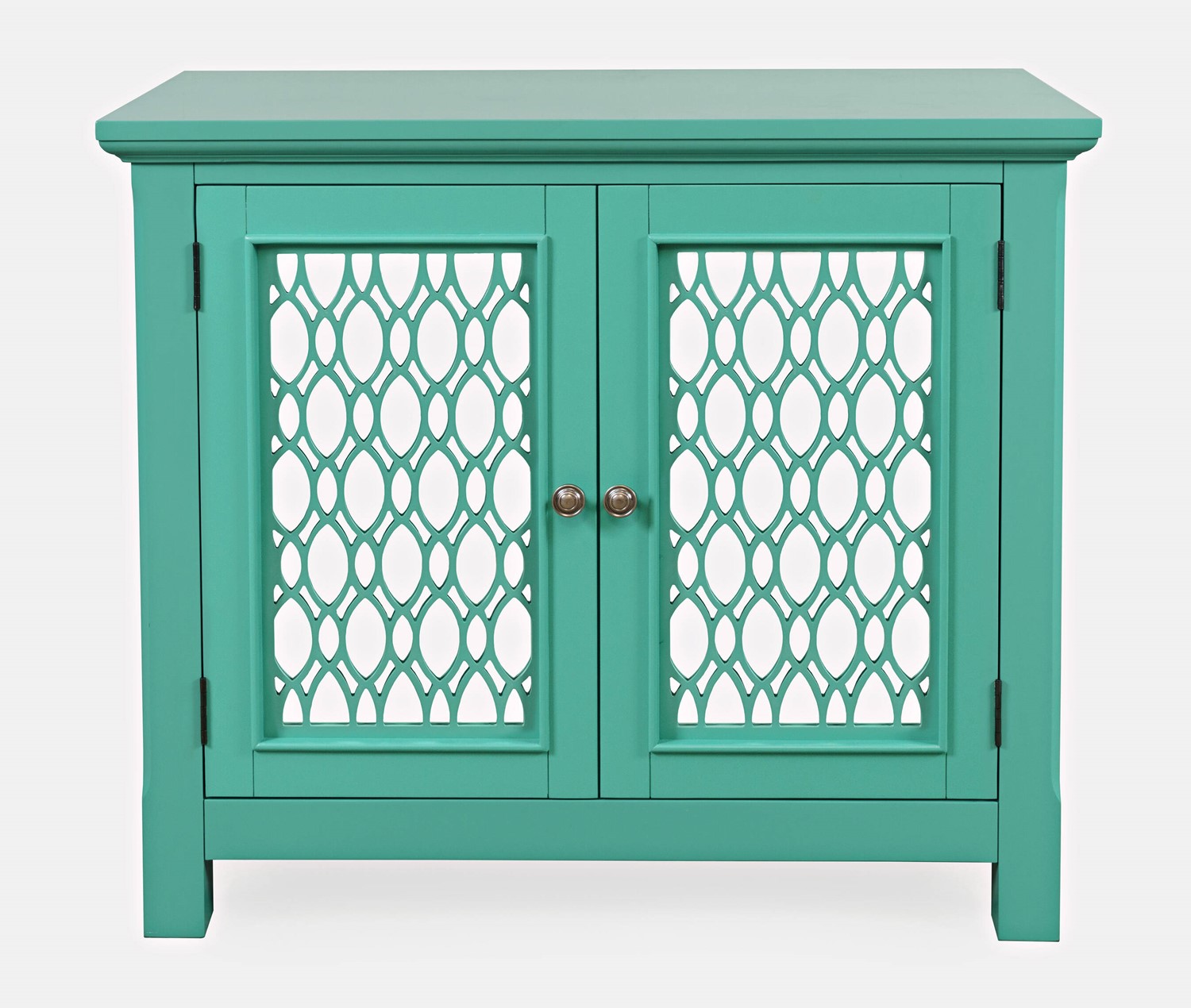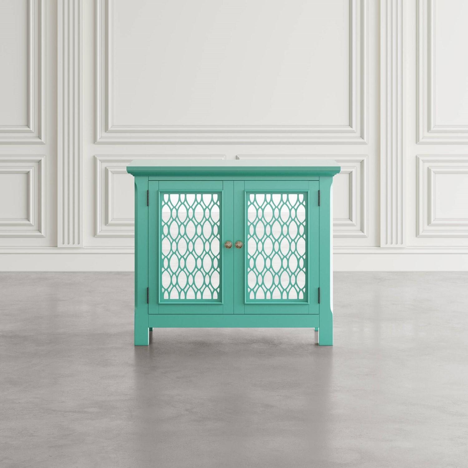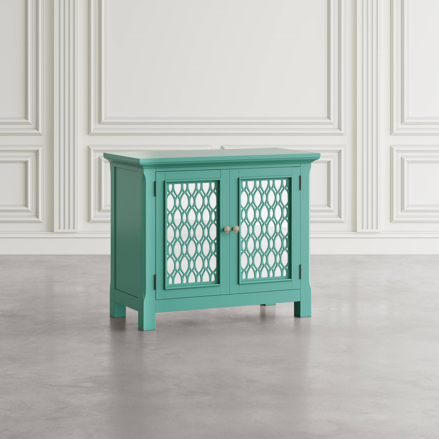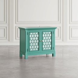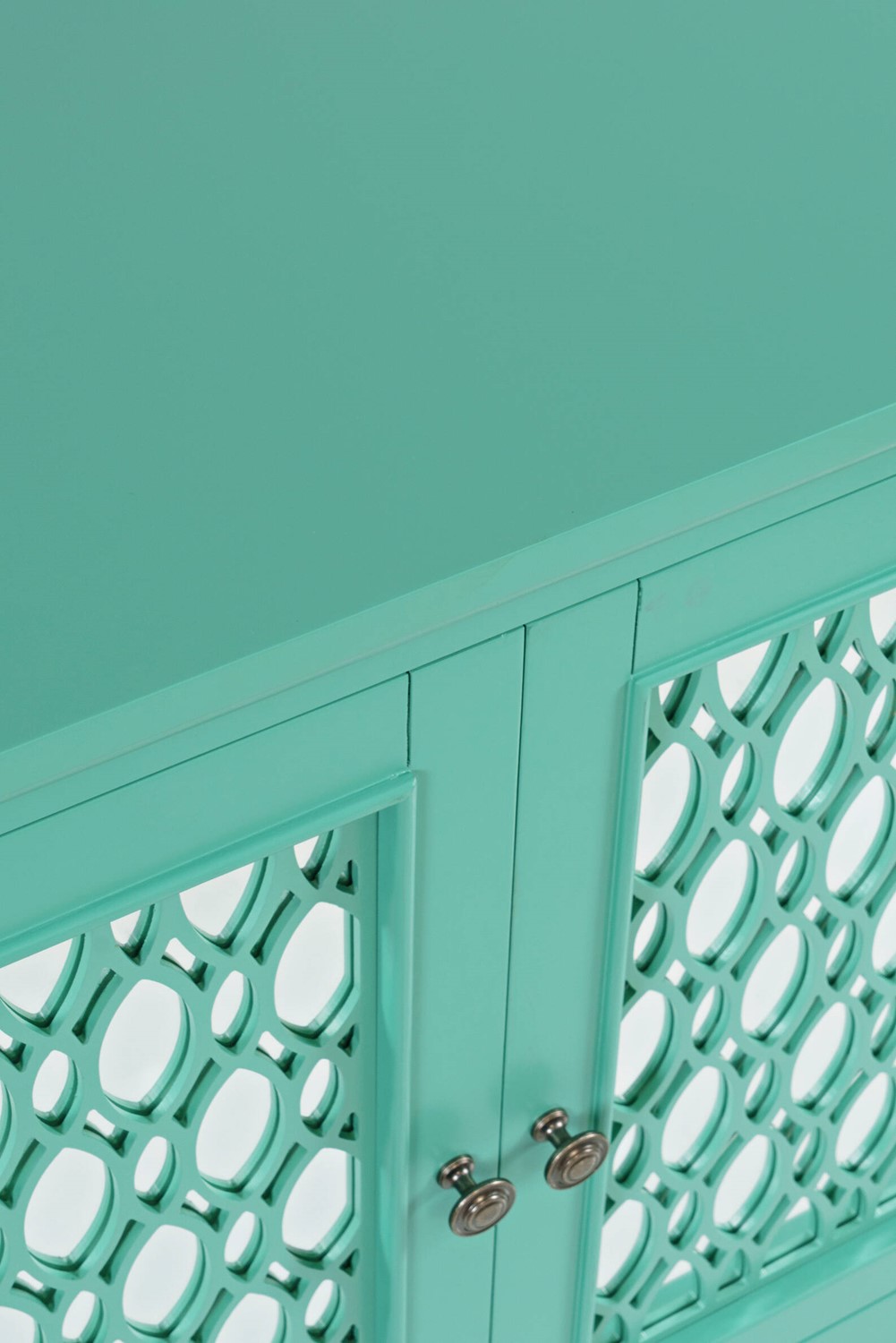 Komoda, która nie tylko przechowuje, ale także odbija piękno swojego otoczenia. Wykonana z drewna akacji i MDF-u, ta komoda prezentuje się w eleganckim turkusowym kolorze, wprowadzając do wnętrza lekkość i świeżość. Dwoje lustrzanych ażurowych drzwiczek dodaje komodzie delikatności i subtelności, a jednocześnie optycznie powiększa przestrzeń. To nietuzinkowe rozwiązanie, które nadaje meblowi wyjątkowego charakteru. Komoda nie tylko utrzymana w nowoczesnym designie, ale także praktyczna dzięki jednej półce, która oferuje dodatkową przestrzeń do przechowywania. Wykorzystanie drewna akacji i MDF-u gwarantuje trwałość i solidność konstrukcji.