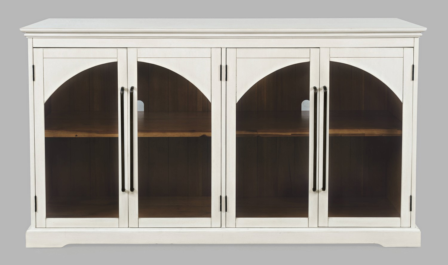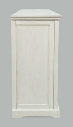 Komoda w odcieniu bieli to nie tylko praktyczny mebel do przechowywania, ale również elegancki element, który dodaje subtelności i stylu każdemu pomieszczeniu. Jej przeszklone drzwi z ozdobnymi łukami to niepowtarzalny detal, który nadaje meblowi wyjątkowego charakteru. Prosta forma komody zostaje przełamana delikatnymi, frezowanymi krawędziami, co dodaje meblowi subtelności i elegancji. Widoczna struktura forniru nadaje całej kompozycji naturalnego, przyjemnego dla oka wyglądu. Eleganckie, podłużne uchwyty nie tylko pełnią funkcję praktyczną, ale także doskonale komponują się z całą estetyką komody.