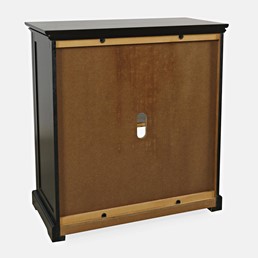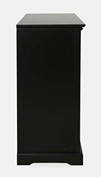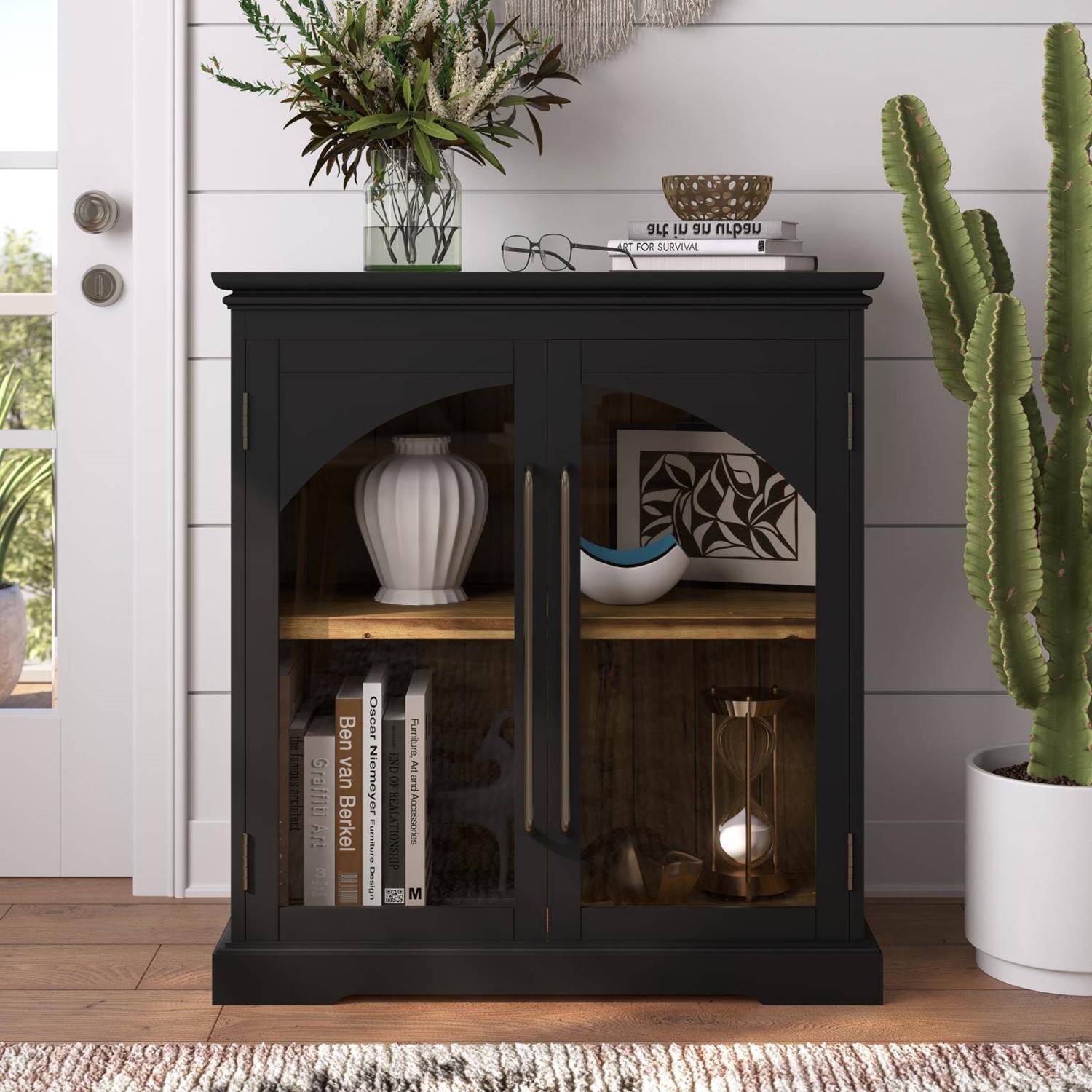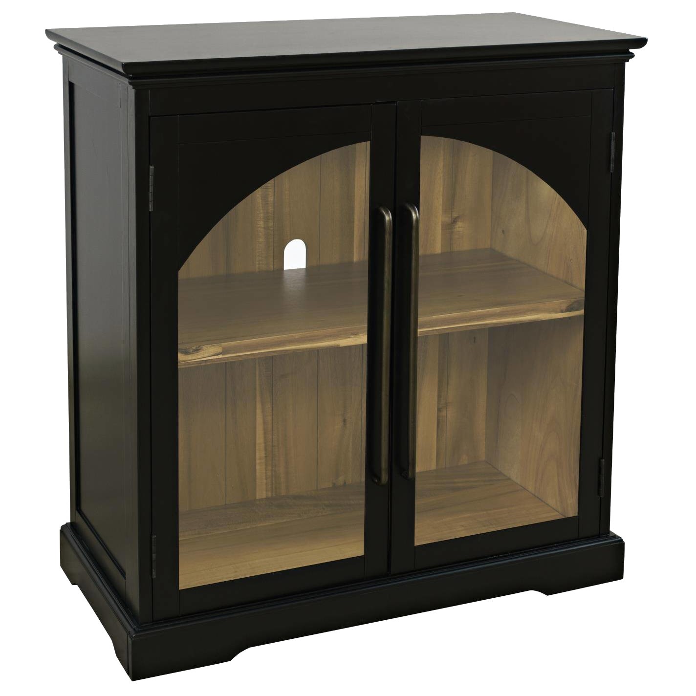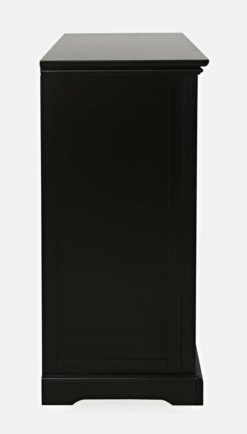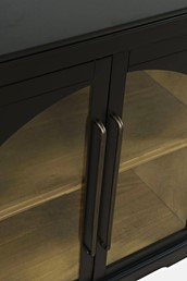 Komoda w kolorze czarnym to nie tylko praktyczny mebel do przechowywania, ale również elegancki element, który dodaje subtelności i stylu każdemu pomieszczeniu. Jej dwoje przeszklonych drzwi z ozdobnymi łukami to niepowtarzalny detal, który nadaje meblowi wyjątkowego charakteru. Prosta forma komody zostaje przełamana delikatnymi, frezowanymi krawędziami, co dodaje meblowi subtelności i elegancji. Widoczna struktura forniru nadaje całej kompozycji naturalnego, przyjemnego dla oka wyglądu. Eleganckie, podłużne uchwyty nie tylko pełnią funkcję praktyczną, ale także doskonale komponują się z całą estetyką komody.