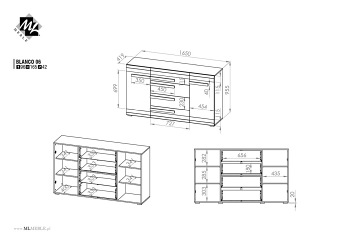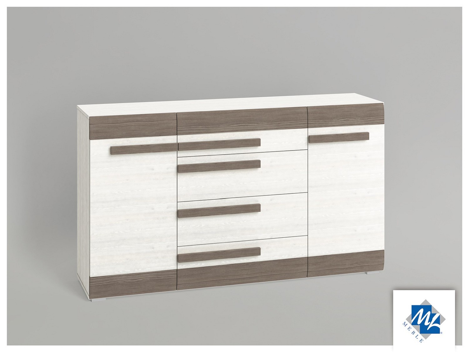 Warto wyrażać swoją indywidualność. Nawet przy wyborze mebli. Dla tych, którzy cenią sobie nowoczesność i niebanalne połączenia kolorystyczne stworzono komodę BLANCO 06. Składa się ona z czterech wzmocnionych od spodu szuflad oraz dwóch szafek bocznych – wewnątrz każdej znajdują się dwie półki. Komoda wykonana została z odpornej na wilgoć i zarysowania płyty laminowanej w kolorze new grey, której trwałość przedłużają odporne na uderzenia obrzeża ABS. Pod względem wyglądu szarość skontrastowano z drewnianymi elementami MDF w kolorze ciemnej sosny śnieżnej, z której wykonano m.in. uchwyty.
