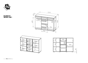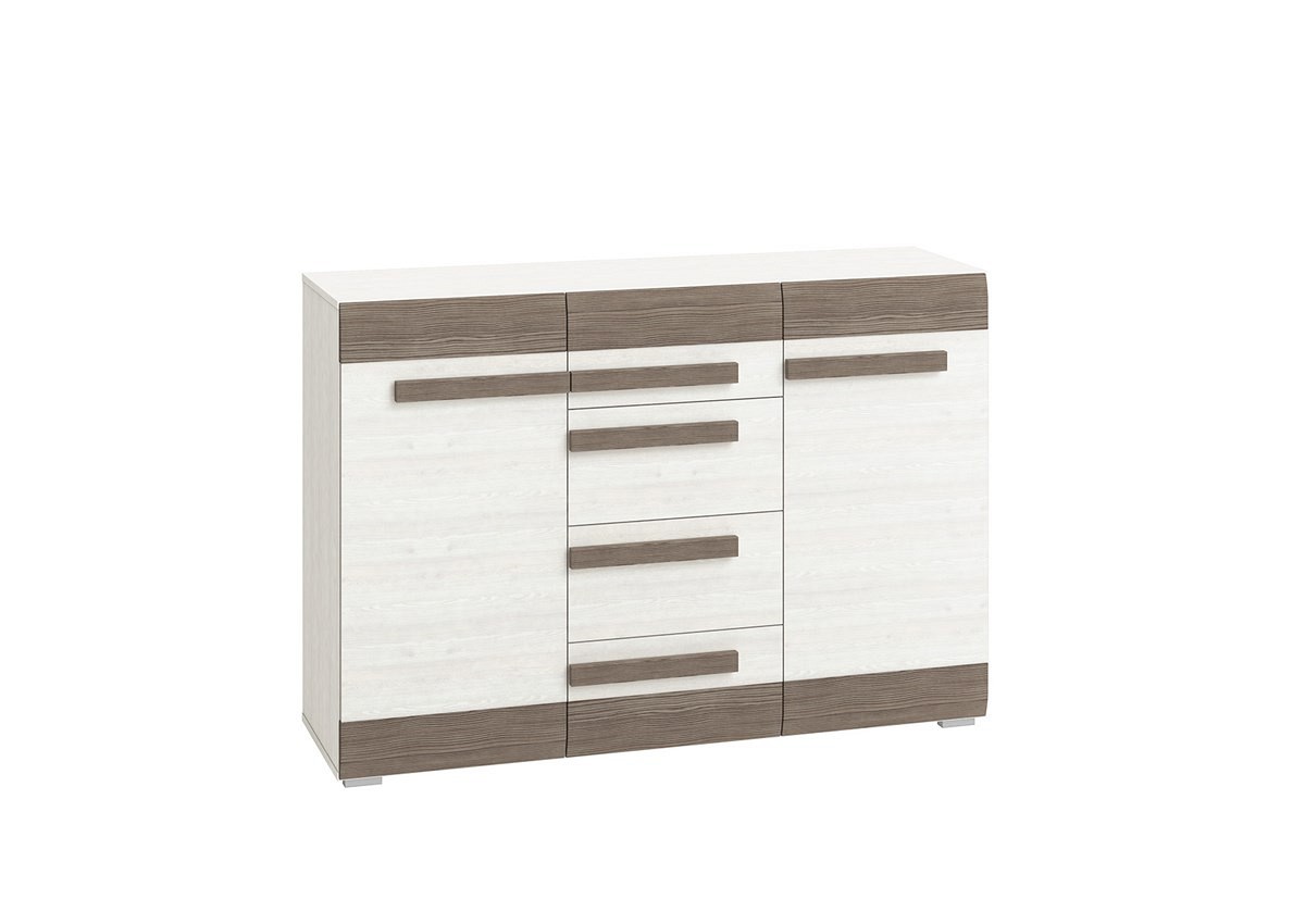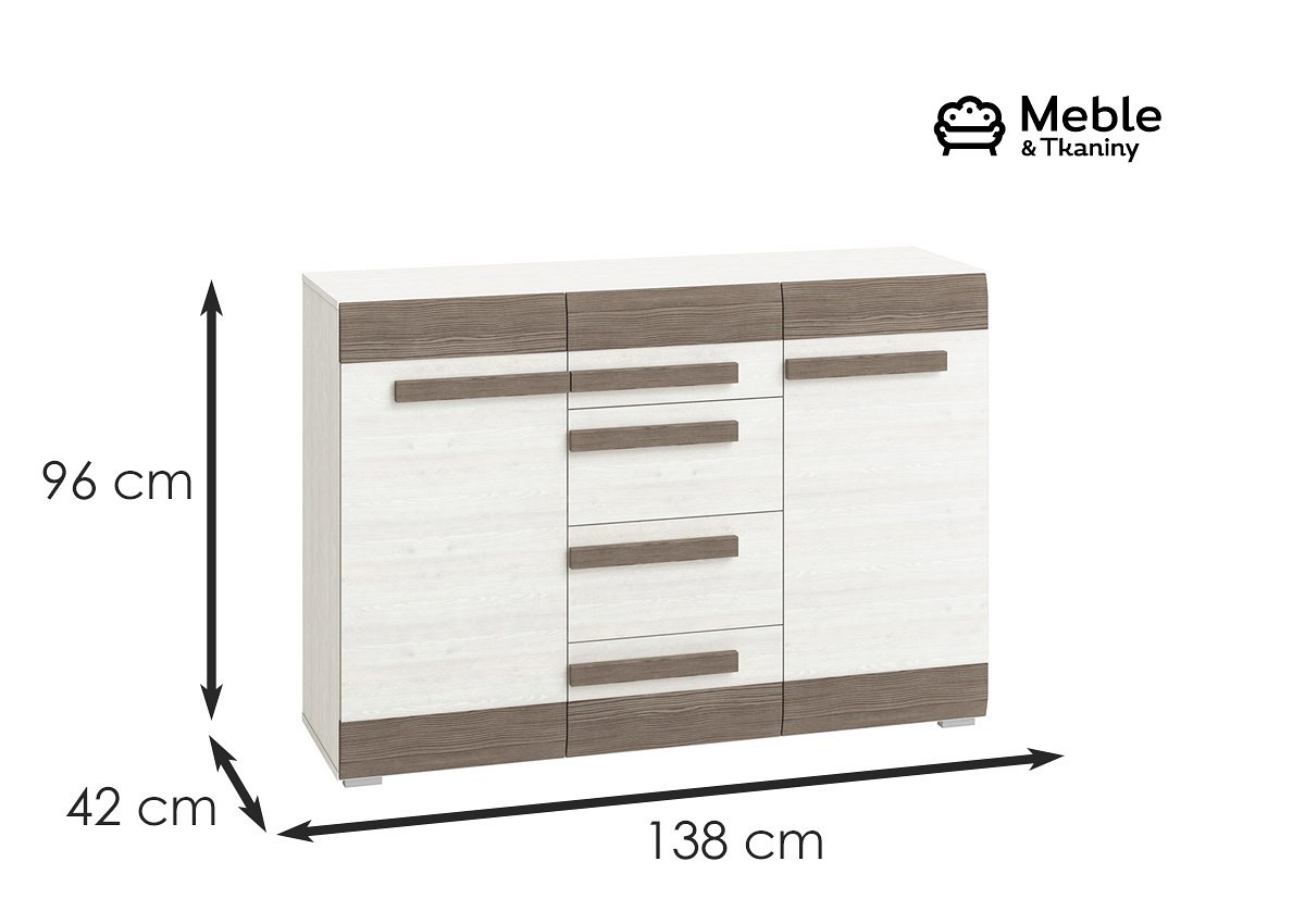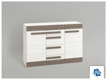 Warto wyrażać swoją indywidualność. Nawet przy wyborze mebli. Dla tych, którzy cenią sobie nowoczesność i niebanalne połączenia kolorystyczne stworzono komodę BLANCO 07. Składa się ona z czterech wzmocnionych od spodu szuflad oraz dwóch szafek bocznych – wewnątrz każdej znajdują się dwie półki. Komoda wykonana została z odpornej na wilgoć i zarysowania płyty laminowanej w kolorze new grey, której trwałość przedłużają odporne na uderzenia obrzeża ABS. Pod względem wyglądu szarość skontrastowano z drewnianymi elementami MDF w kolorze ciemnej sosny śnieżnej, z której wykonano m.in. uchwyty.