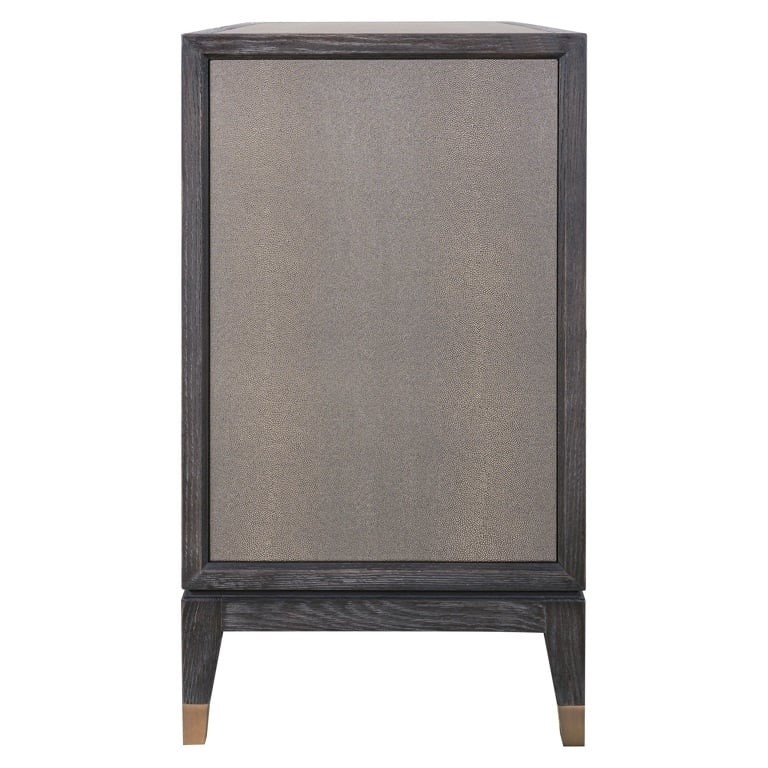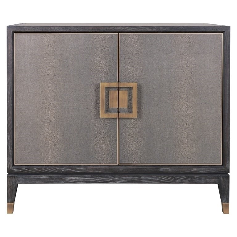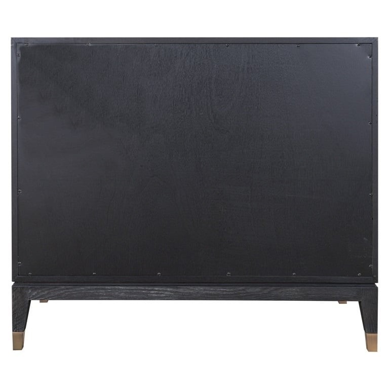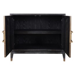 Komoda Bloomville to połączenie elegancji i funkcjonalności. Ramy wykonane z dębu bejcowanego na czarno w połączeniu z geometrycznymi uchwytami w kolorze mosiądzu nadają jej nowoczesnego, ale klasycznego charakteru. Drzwi ozdobione repliką skóry shagreen, nawiązującą do lat 20. XX wieku, dodają jej unikalnego stylu. Praktyczne wnętrze komody, z dwiema półkami ukrytymi za drzwiczkami, sprawia, że jest to doskonały wybór do klasycznych wnętrz, które zyskają wyjątkowy charakter.