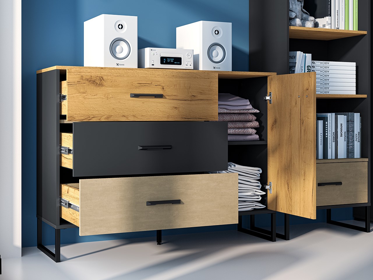 Komoda to funkcjonalny mebel, który wprowadza ład i estetykę do każdej przestrzeni mieszkalnej. Dzięki starannie wykonanym szufladom i półkom komoda pozwala na wygodne przechowywanie ubrań, akcesoriów czy dokumentów. Solidne materiały gwarantują trwałość oraz stylowy wygląd, dzięki czemu mebel doskonale sprawdzi się zarówno w salonie, jak i sypialni czy biurze.