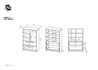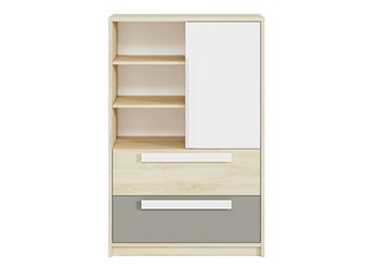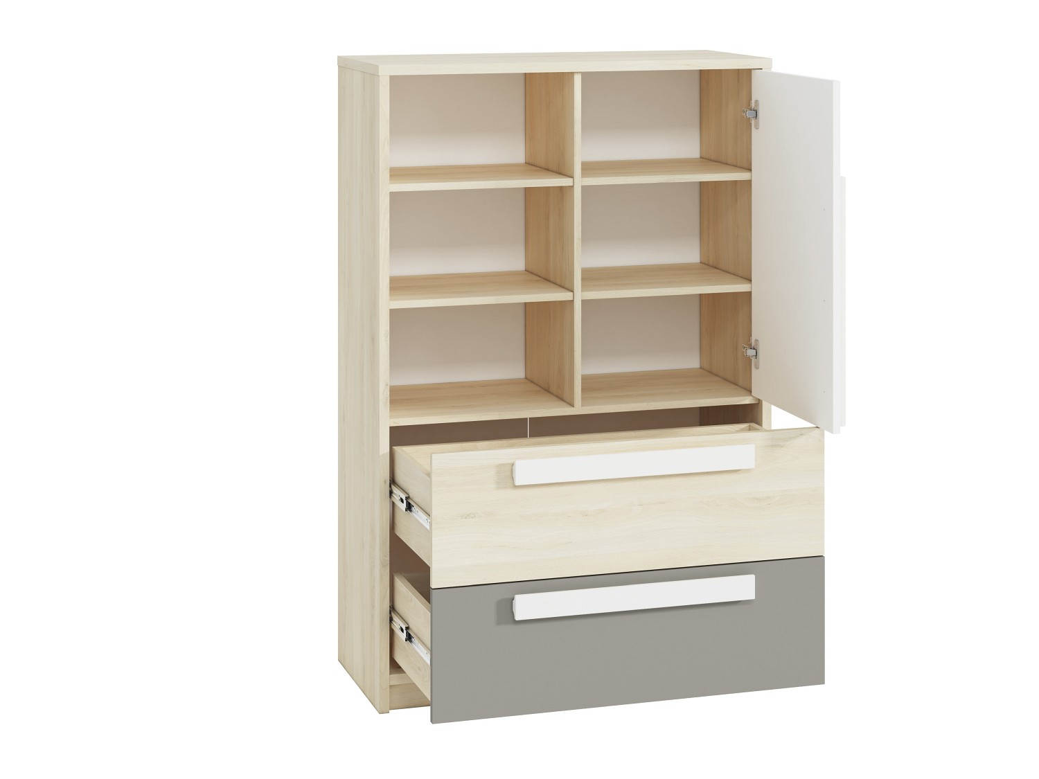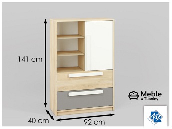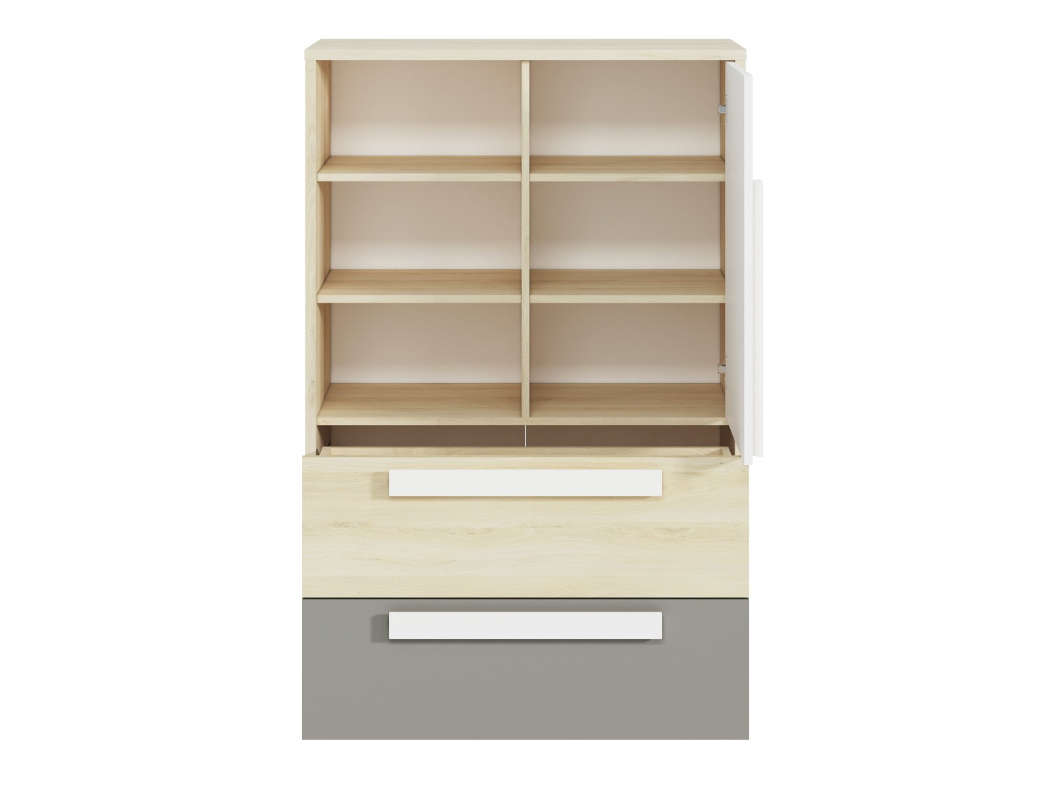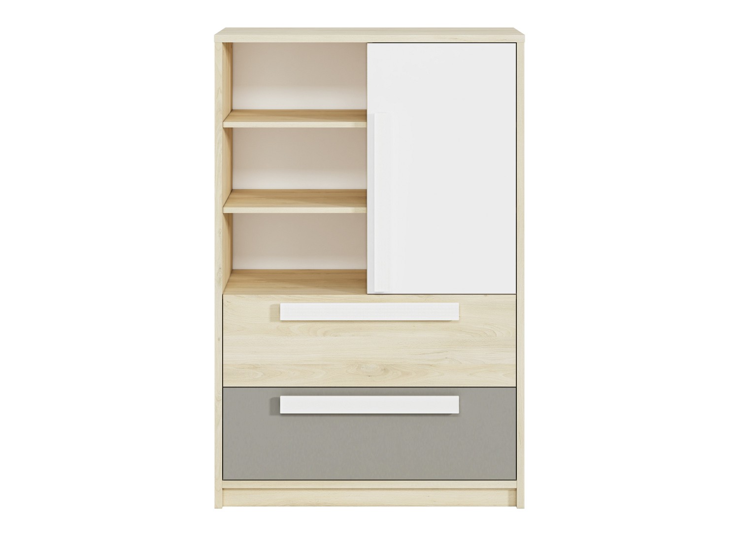W tej nieprzeciętnej komodzie Drop 07 połączono ze sobą dwie pojemne szuflady o pełnym wysuwie z szafeczką i trzema drobnymi półkami. Całość wykonana została z odpornej na wysoką temperaturę, wilgoć i zarysowania płyty laminowanej w kolorze buk fjord. O jeszcze większą trwałość Drop 07 dbają obrzeża ABS przeciwdziałające zniszczeniom spowodowanym przez uderzenia. Natomiast wyjątkową stylistykę mebla gwarantuje biały front drzwi wyposażony w duże, geometryczne uchwyty.
