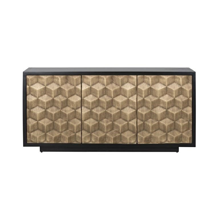 Komoda ESHER to trzydrzwiowa komoda, która idealnie nadaje się do przechowywania ubrań, przedmiotów gospodarstwa domowego lub innych akcesoriów. Wykonana z wysokiej jakości płyty MDF w kolorze złotym oraz drewna. Sklada się z sześciu pojemnych pólek. Komoda ESHER jest trwała i łatwa w czyszczeniu. Solidne materiały i zapewniają wytrzymałość i wytrzymałość, a awangardowy styl szafek dodają jej wyglądu. Komoda ESHER ma szczególnie atrakcyjny wygląd, który sprawia, że jest łatwa do dopasowania do wnętrza. Komoda ESHER to idealny dodatek do salonu