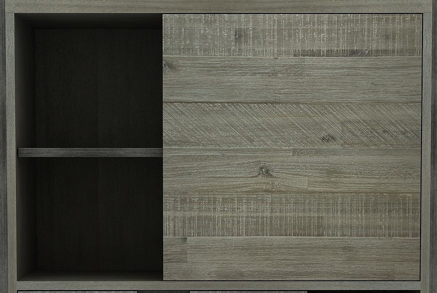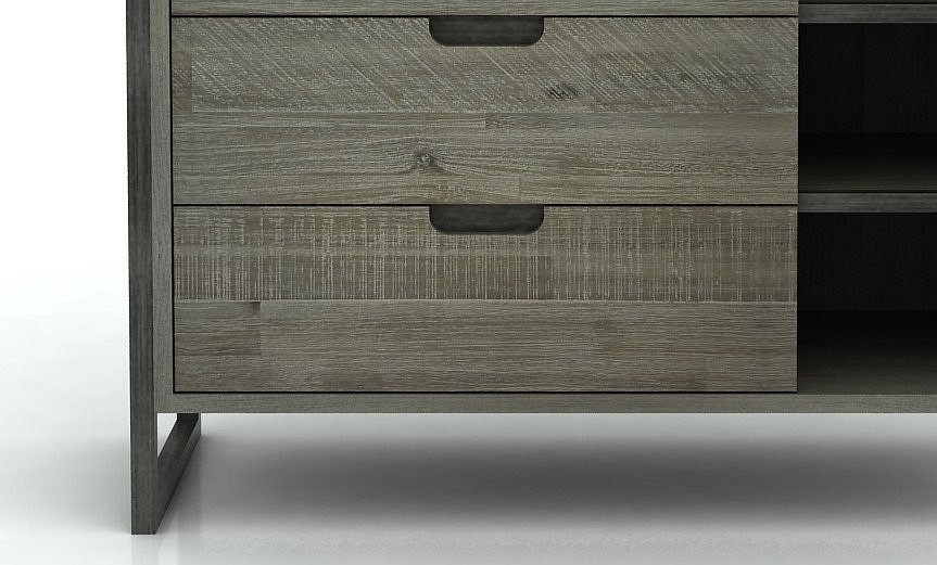 Komoda loftowa w całości z oryginalnego drewna, wykonana z wysokiej jakości czesanego egzotycznego drewna akacjowego, z frezowanymi uchwytami. Proste, grafitowe nogi ze szczotkowanego metalu w ciepłych tonach tworzą część ciała całego ciała. Detale frontowe i boczne wykonane są z drewna w kolorze piaskowym, tworząc niejednorodną strukturę. Produkt posiada otwierane drzwi, trzy szuflady, pierwsza szuflada jest owinięta aksamitem, a pięć półek wykończonych metalem.