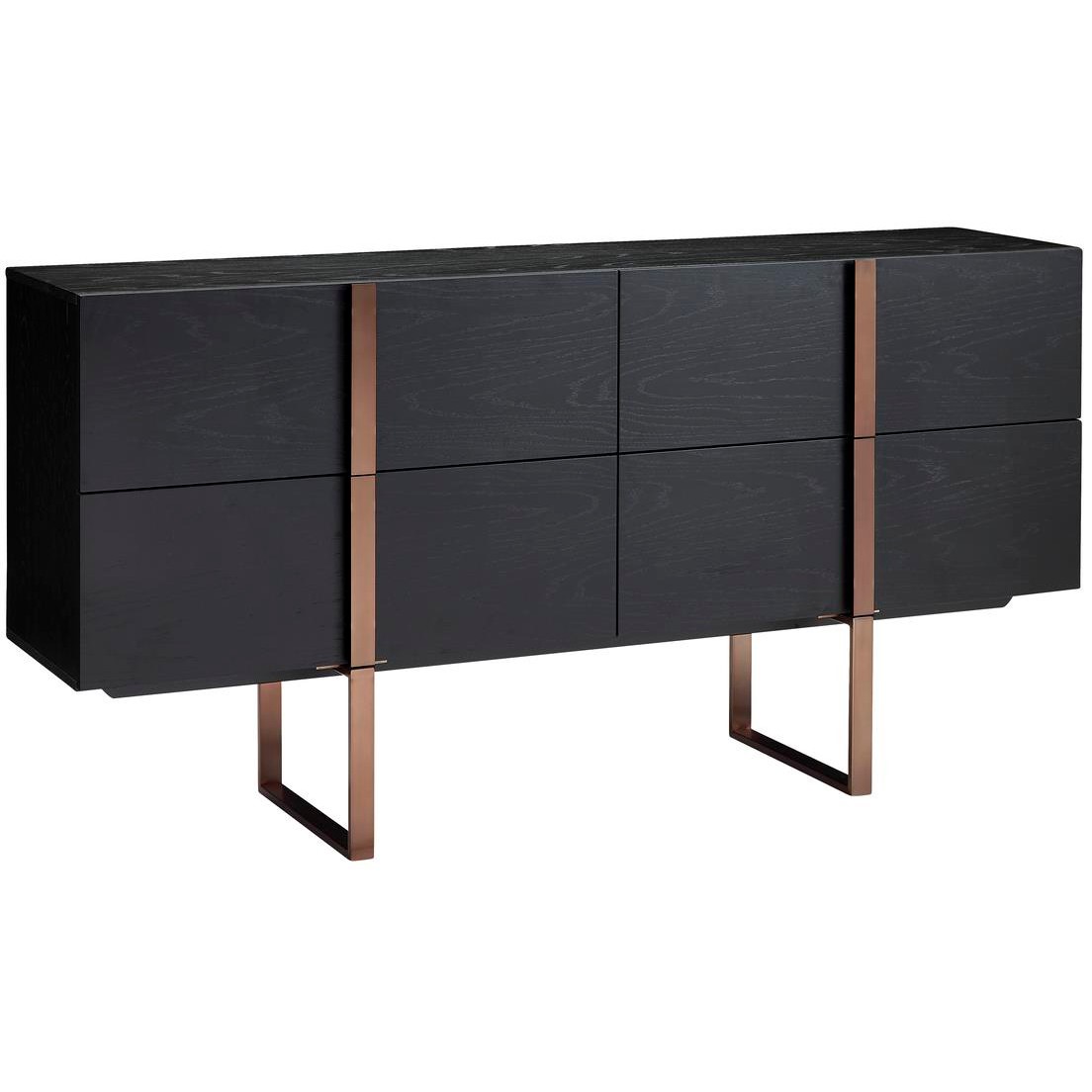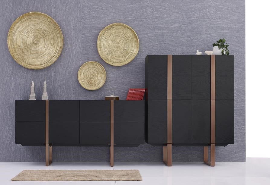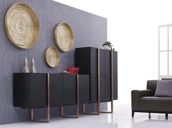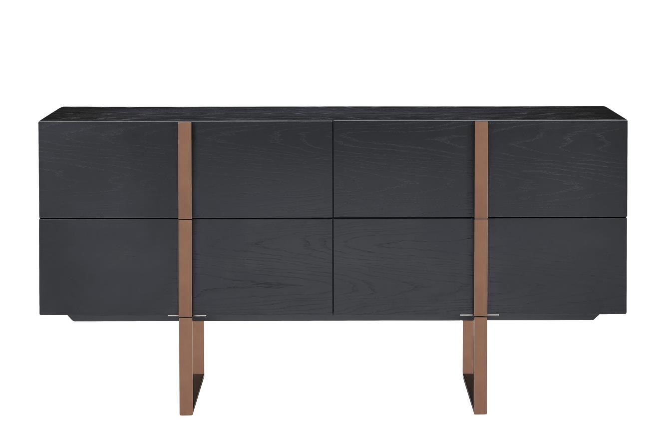 Komoda w kolorze czarnym z subtelnymi akcentami różowego złota to połączenie elegancji, nowoczesności i wyrafinowanego stylu. Jej wyjątkowy design przyciąga uwagę i dodaje charakteru każdemu wnętrzu. Korpus komody wyróżnia się widoczną strukturą drewna, co nadaje jej naturalnego uroku i dodaje ciepła do industrialnego klimatu czerni. Nogi w odcieniu różowego złota dodają komodzie luksusowego wyglądu oraz subtelności, tworząc harmonijne połączenie z klasycznym kolorem czarnym. Uchwyty szuflad, wykonane w tym samym odcieniu złota, co nogi komody, dodają elegancji i spójności całej konstrukcji. Ich minimalistyczny design idealnie komponuje się z prostą formą mebla, podkreślając jego nowoczesny charakter. Komoda wyposażona jest w cztery szuflady z systemem soft-close, co zapewnia ciche i płynne zamykanie, a także dodatkowy komfort użytkowania.