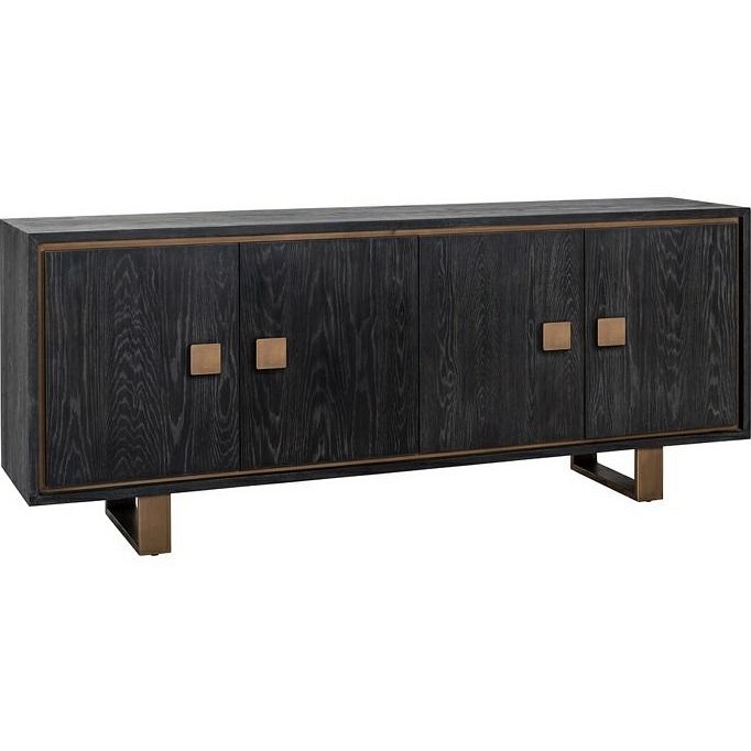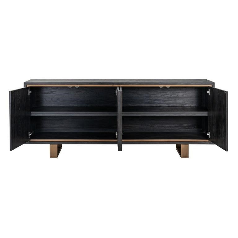 Proponowany model to Komoda HUNTER 4-Drzwiowa Czarny/Złoty. Jest to wytrzymała i praktyczna komoda jest wykonana w całości z forniru z czarnego dębu połączonego z ramami ze stali nierdzewnej i metalowymi detalami takimi jak uchwyty w subtelnym kolorze mosiądzu. Jest ona wyposażona w cztery pojemne szuflady oraz cztery solidne drzwi. Komoda ma szeroki blat, który można wykorzystać do umieszczenia ozdób lub innych przedmiotów dekoracyjnych. Meble są ozdobione złotymi uchwytami, które nadają im elegancki wygląd. Idealnie sprawdzi się do salonu lub sypialni.