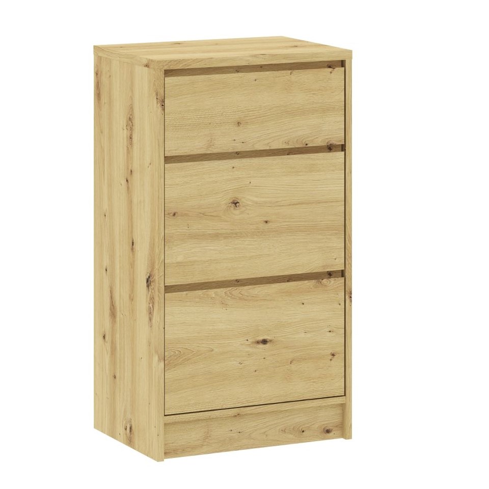 Prezentowana komoda to praktyczny i stylowy mebel, który doskonale sprawdzi się w salonie, sypialni, przedpokoju lub biurze. Solidna konstrukcja gwarantuje trwałość i stabilność użytkowania przez wiele lat. Prosty, a jednocześnie elegancki design sprawia, że komoda świetnie komponuje się z różnymi stylami aranżacyjnymi. Gładkie fronty i staranne wykończenie nadają jej nowoczesny charakter. Dzięki kompaktowym wymiarom mebel nie zajmuje dużo miejsca, a jednocześnie oferuje sporą przestrzeń do przechowywania. To idealne połączenie praktyczności, estetyki i trwałości w jednym meblu. W zestawie znajdują się dwa warianty kolorystyczne listwy między szufladami – dąb artisan oraz antracyt.