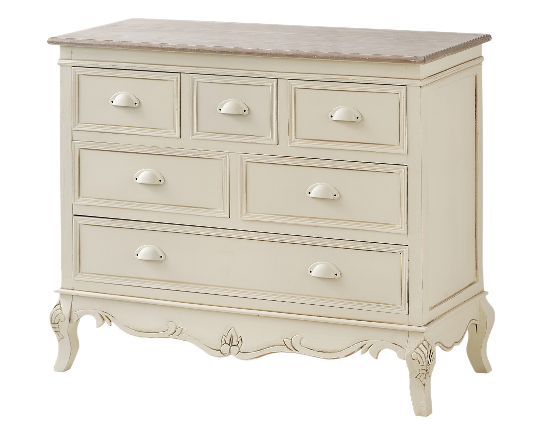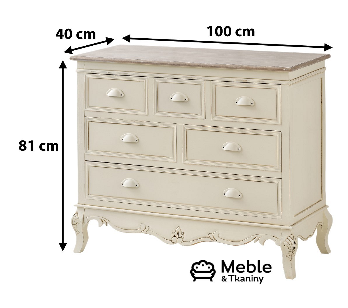 Uniwersalna - taka jest komoda Rimini Jej cudowne kształty skradną serca miłośników stylu francuskiego. Uniwersalny wygląd pozwalaja wykorzystać ją zarówno w sypialni, jak również w holu lub łazience. Wszystko zależy od Twoich potrzeb.Gustowne rzeźbienia, metalowe okucia i smukłe nóżki zdecydowanie nadają jej uroku. Całość jest bardzo dobrze wkomponuje się w jasne wnętrze w, a sześć szuflad pomoże Ci utrzymać w niej porządek. Jeżeli zamiast beżu preferujesz biel, sprawdź model RI024W.