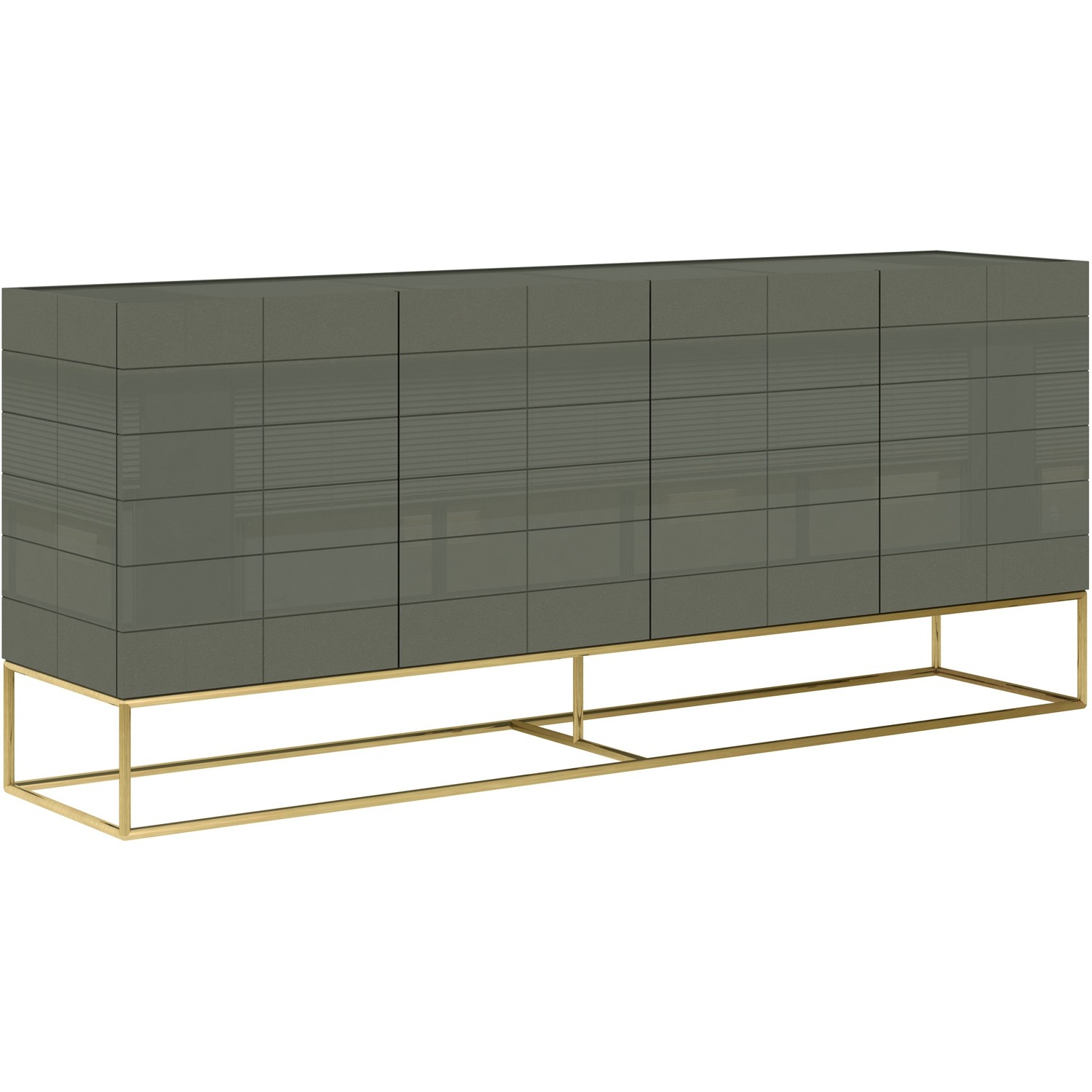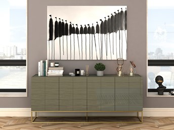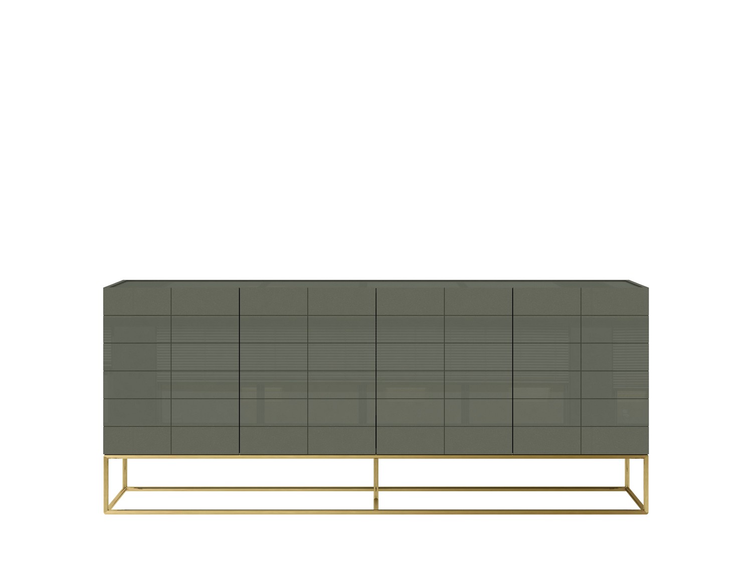 Komoda w stylu modern classic w kolorze cementowej zieleni z kontrastującymi nogami w kolorze złota wykonane ze stali nierdzewnej. Korpus z płyty MDF w połysku. Fronty 3D w połączeniu z minimalistyczną formą bryły tworzą harmonijna całość.