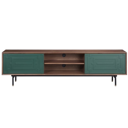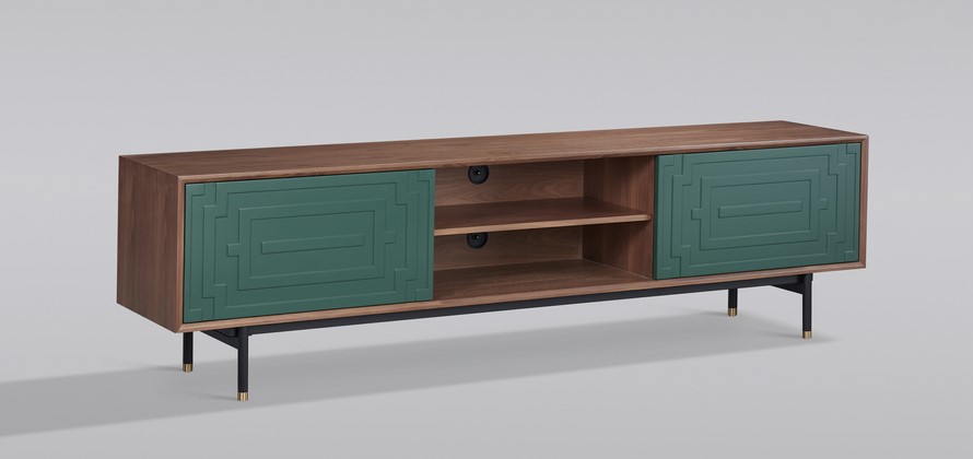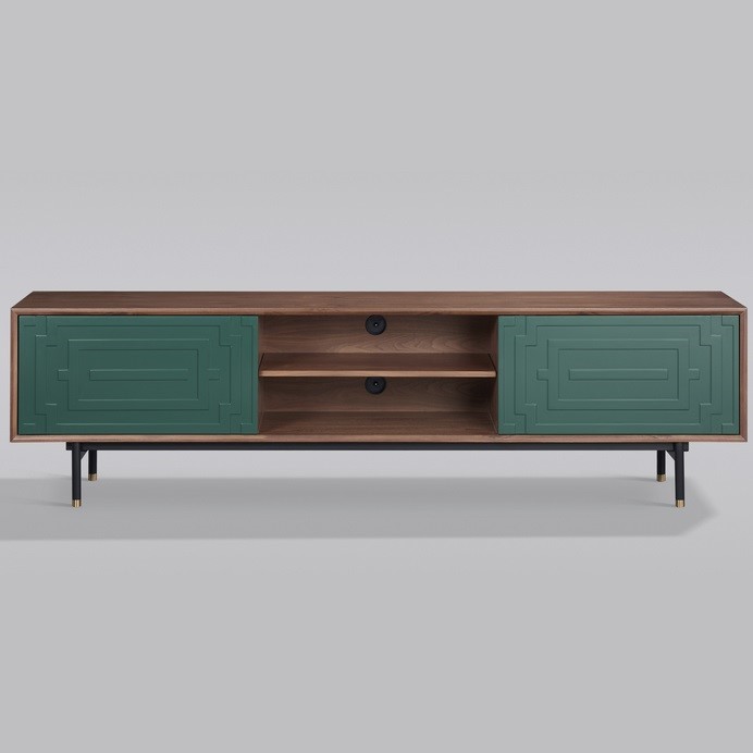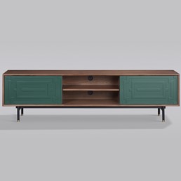 Komoda RTV Stilig ST153 przyciąga uwagę oryginalnym zestawieniem kolorów i geometrycznym wzorem na froncie. Ciepła orzechowa okleina kontrastuje z miętową zielenią, a funkcjonalny system push-to-open ułatwia użytkowanie. To stylowy dodatek, który doskonale wpisuje się w nowoczesne i retro aranżacje.