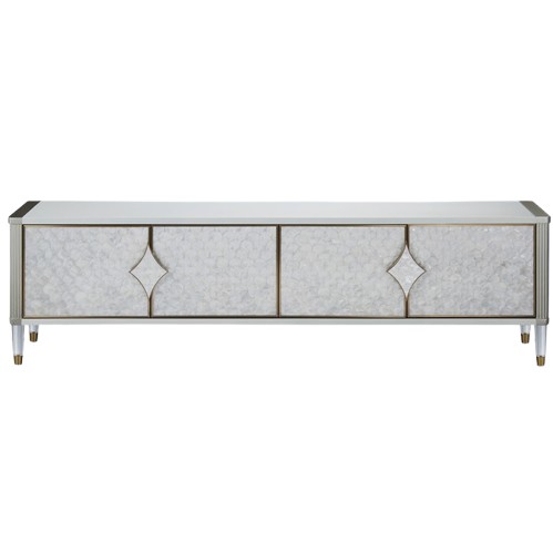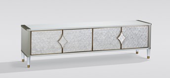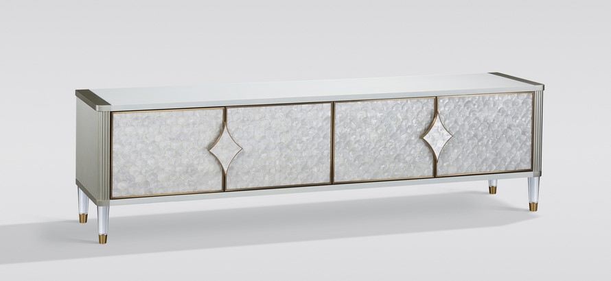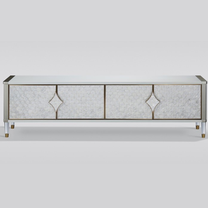 Komoda RTV Stilig ST201 to unikalne połączenie elegancji i funkcjonalności. Front z muszli morskiej tworzy wzór łusek, a złote detale nadają całości luksusowy wygląd. Dzięki regulowanym półkom i akrylowym nogom, komoda jest stabilna i funkcjonalna, idealna do nowoczesnych wnętrz.