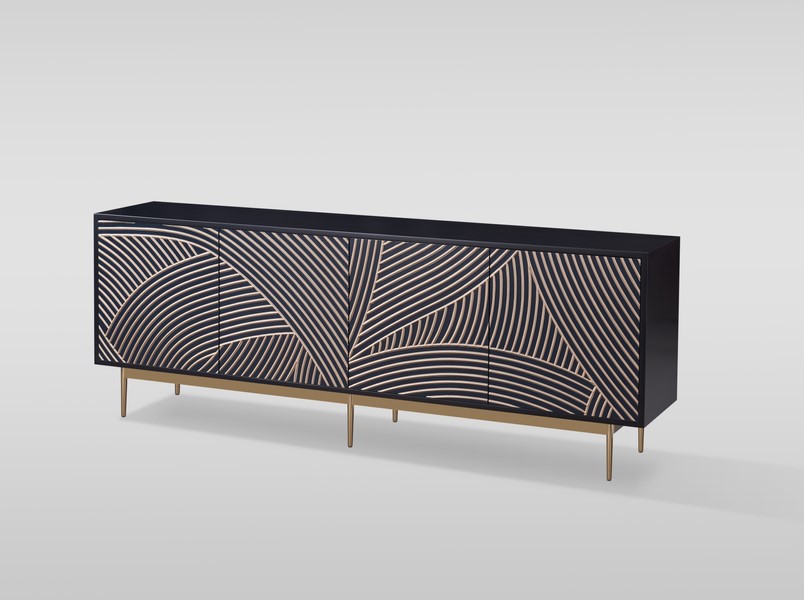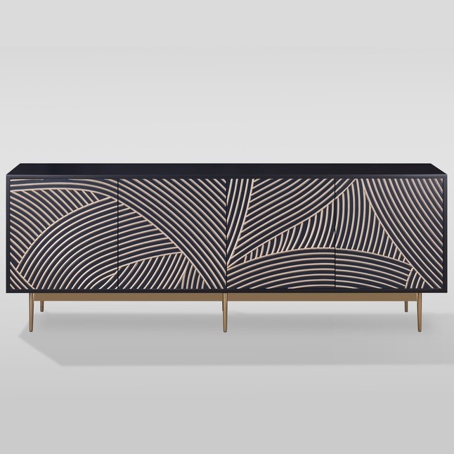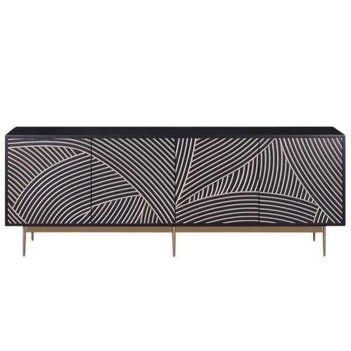 Komoda RTV Stilig ST316 to połączenie wyrafinowanego stylu i nowoczesnej funkcjonalności. Granatowy korpus kontrastuje z ozdobnym, złotym frontem, co nadaje jej ekskluzywny charakter. Idealnie sprawdzi się w eleganckich wnętrzach, zapewniając dodatkową przestrzeń do przechowywania oraz wyjątkowy akcent dekoracyjny.