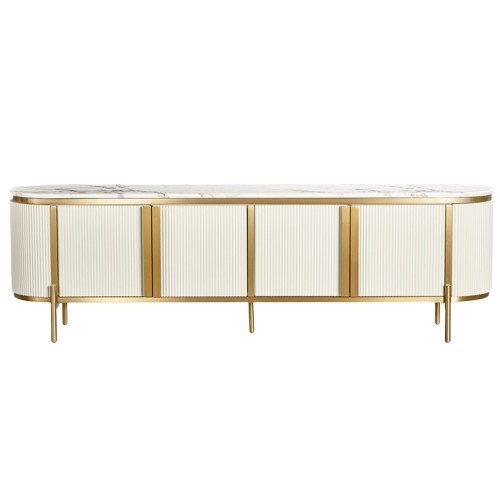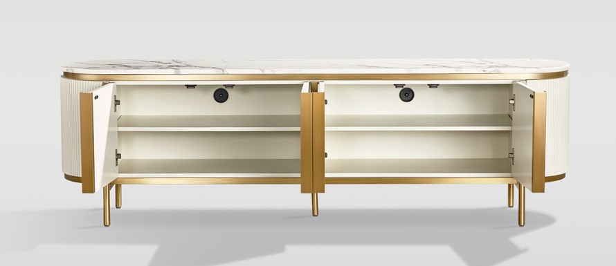 Komoda RTV Stilig ST382C to elegancki mebel, który doskonale wpisze się w styl nowoczesnych wnętrz. Jej korpus wykonany jest z MDF w kolorze białym ecru, a złote nogi i marmurowy blat dodają luksusowego charakteru. Ryflowane drewno oraz regulowane półki pozwalają na indywidualne dostosowanie przestrzeni. System soft close zapewnia komfort użytkowania, a solidna konstrukcja sprawia, że jest to wybór idealny do salonu.