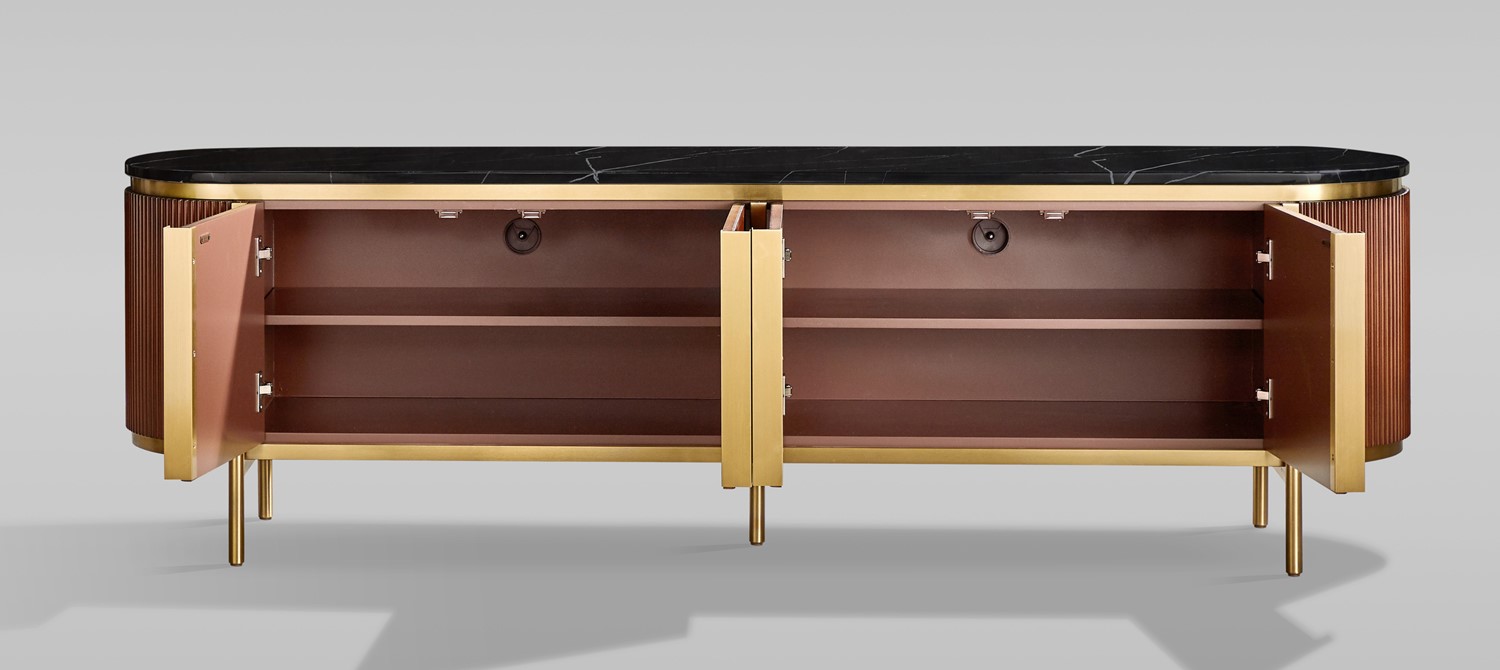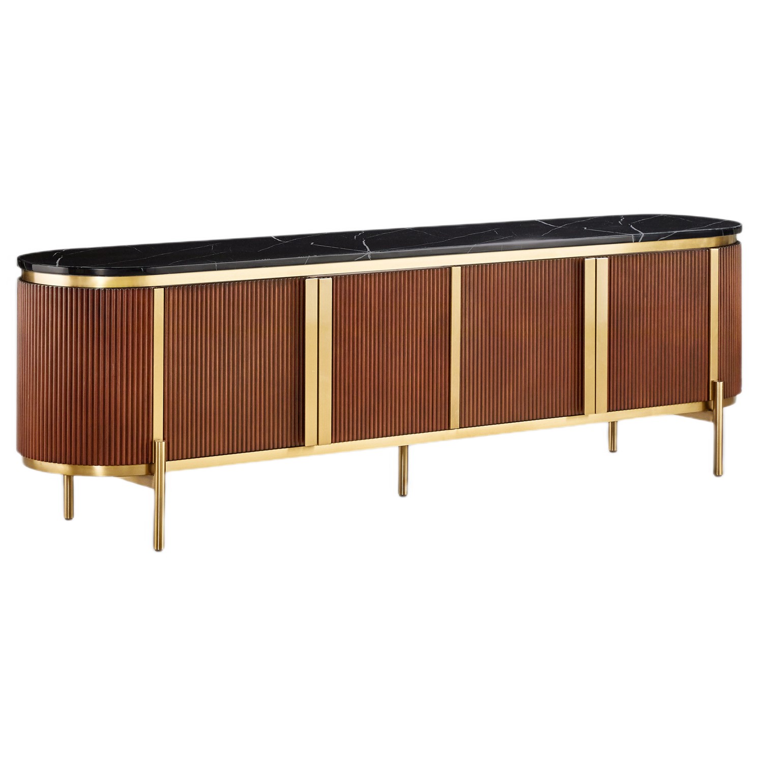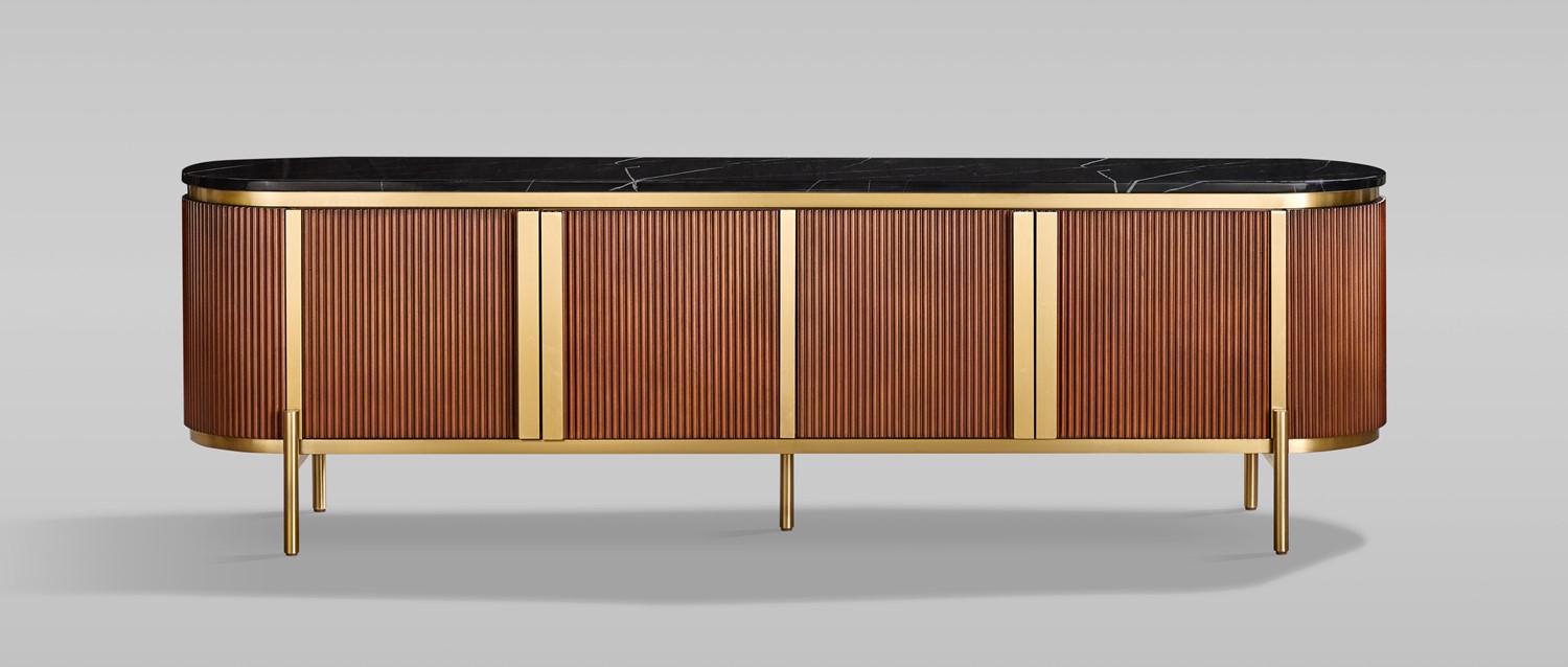 Stylowa komoda w kolorze kasztanowym to elegancki mebel, który dodaje wnętrzu wyrafinowanego charakteru. Złote akcenty oraz nogi komody nadają jej luksusowego wyglądu i subtelnego blasku, nadając pomieszczeniu wyjątkowego nastroju. Korpus komody wykonany z ryflowanego drewna dodaje meblowi tekstury i charakteru, tworząc interesujący wizualny efekt. Blat z wykończeniem marmurowym podkreśla elegancję i prestiż komody, nadając jej dodatkowego uroku. Ta komoda nie tylko jest praktycznym meblem do przechowywania, ale także jest wyjątkowym elementem dekoracyjnym, który nadaje wnętrzu charakteru i stylu. Niech stanie się ona centralnym punktem Twojej przestrzeni, dodając jej elegancji i wyrafinowania.